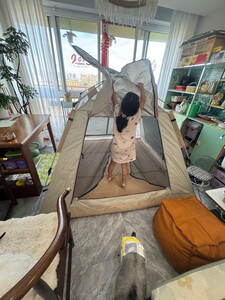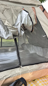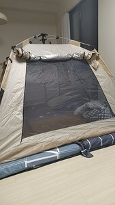 帐篷收到了,尺寸买的不合适,将就使用吧,还有一个小插曲也没跟客服讲(门的绑带在拉锁头内,不知道是做工问题还是有人退货的,没办法用剪子剪断了,这样就是尺寸不对也没办法换货了),总体质量挺好的,通透性也很高,就是不知道能不能用多久,本来是要放进去两个90*200mm的垫子,就买了2.1米*2.1米的,结果尺寸是帐篷四角的尺寸而不是布的尺寸,主要是没细看尺寸说明。 防水效果:在室内使用 适用场景:室内外 容纳人数:两人 透气效果:通透 展开类型:还是很好 便携性能:有手提兜