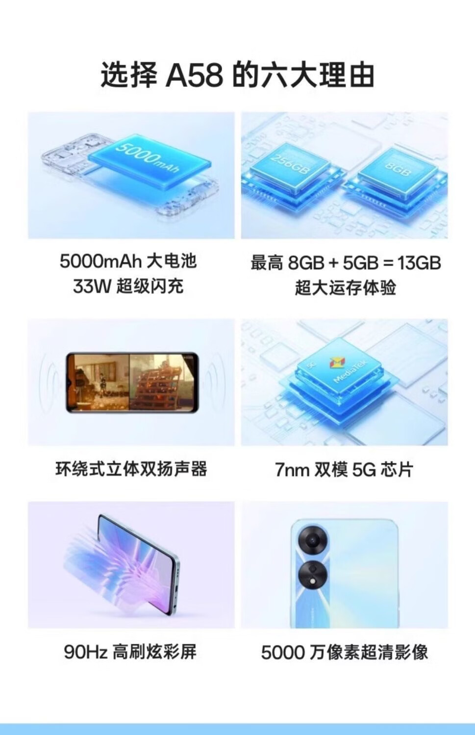 OPPOA58 全网通5G智能手机拍照美颜游戏手机环绕式立体声大电池备用机 OPPO A58静海蓝 8+128 全网通 5G
