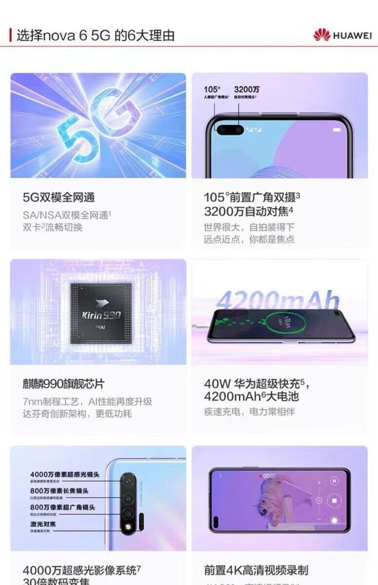 华为Nova 6 全网通nfc麒麟990芯片 5G超清三摄全智能手机送壳膜 蓝色 8G+【256G】 全网通5G
