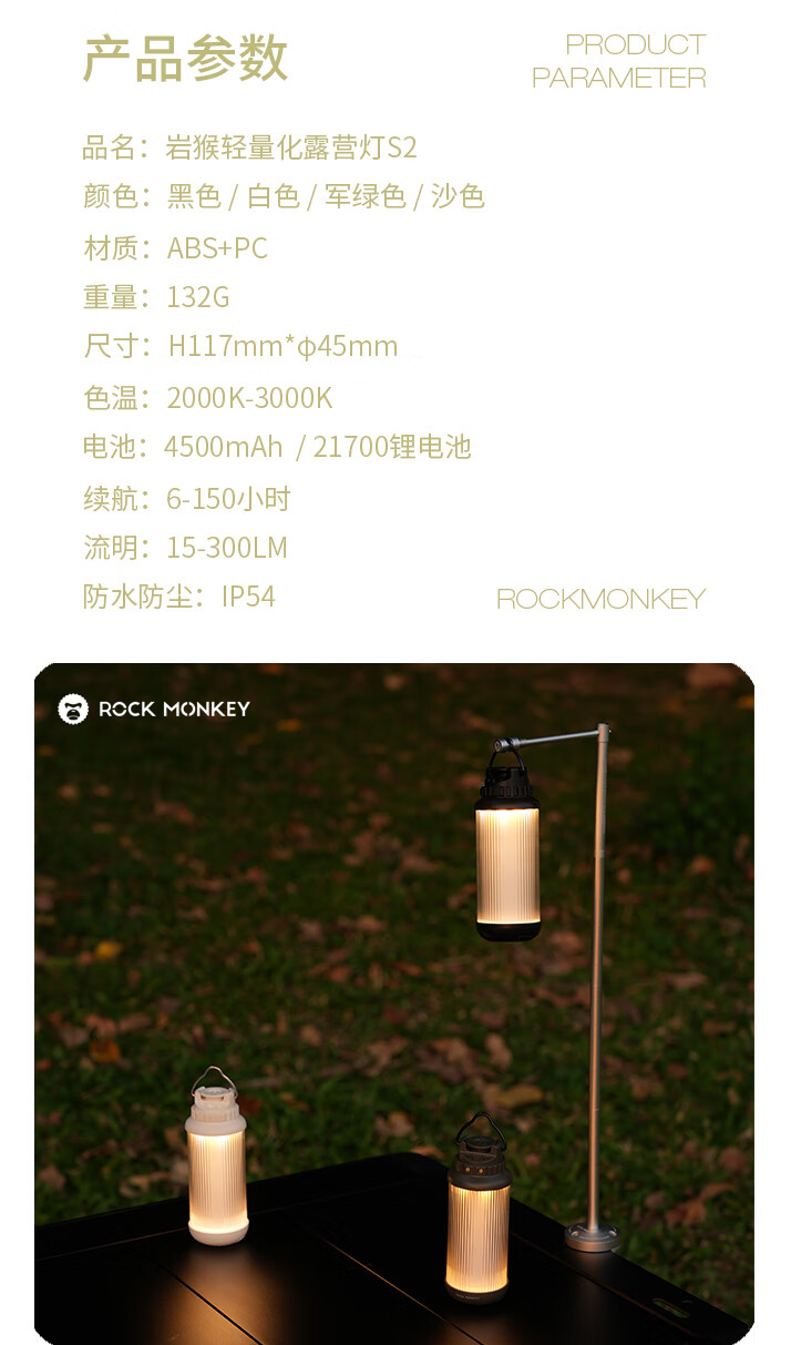 ROCK MONKEY岩猴S2户外露营便携式轻量化迷你野营灯充电徒步背包灯磁吸可充电 S2露营灯-白色