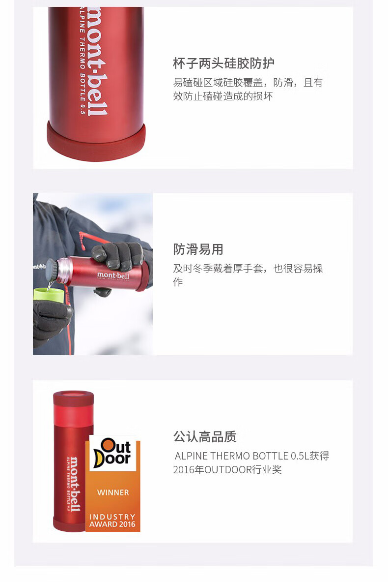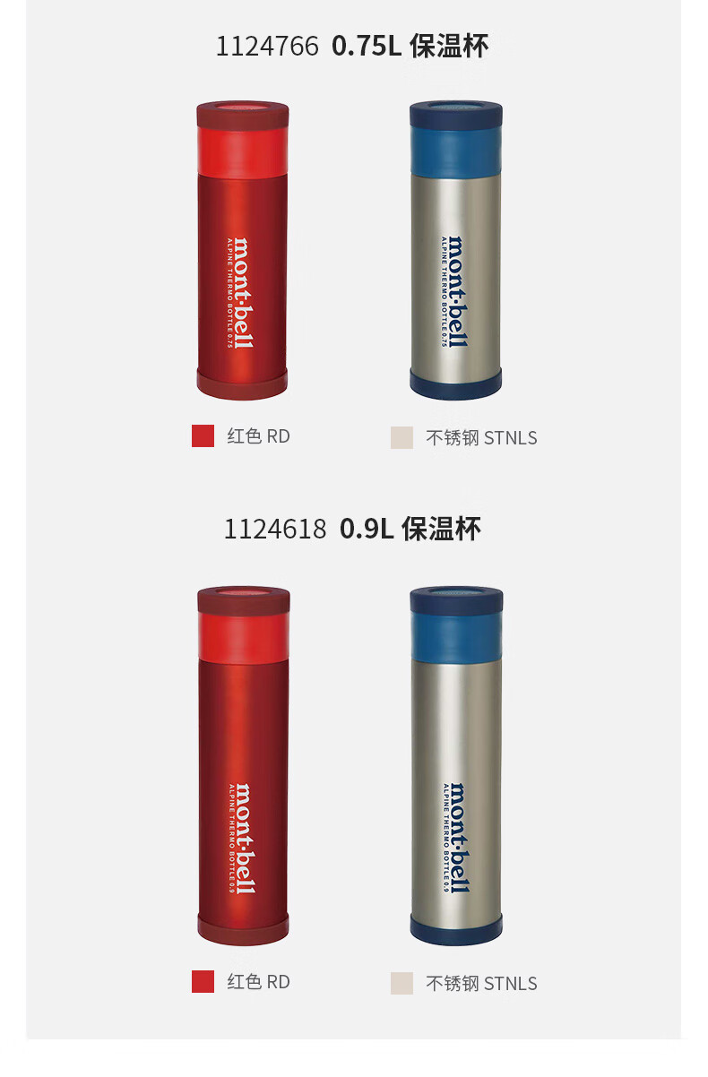 mont·bell保温杯超轻户外男女大容量运动不锈钢便携防漏水杯 1124618红色0.9L