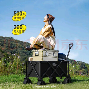 原始人露营推车户外营地拖车便携折叠手推野餐野营快递手拉车遛娃小拉车 300L 铝合金聚拢款曜黑-特粗铝架+双刹万向快拆越野轮