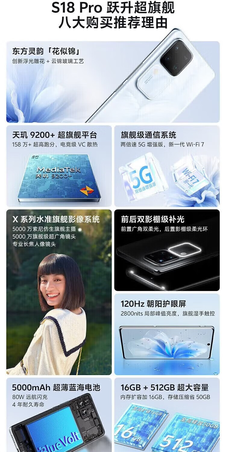 vivo S18 Pro天玑9200+分期免息白条可选蓝海电池拍照手机 花似锦 官方标配16GB+256GB