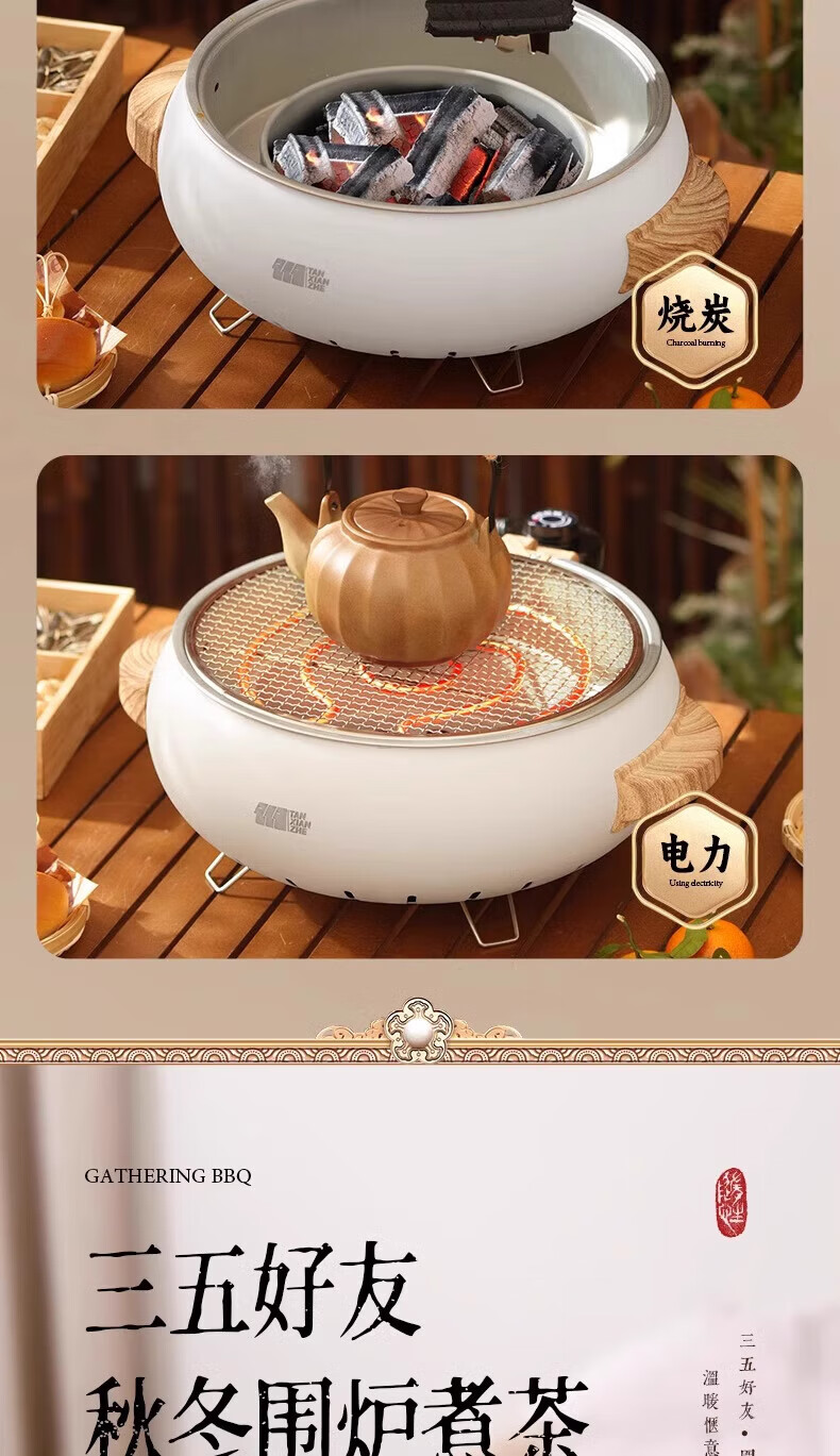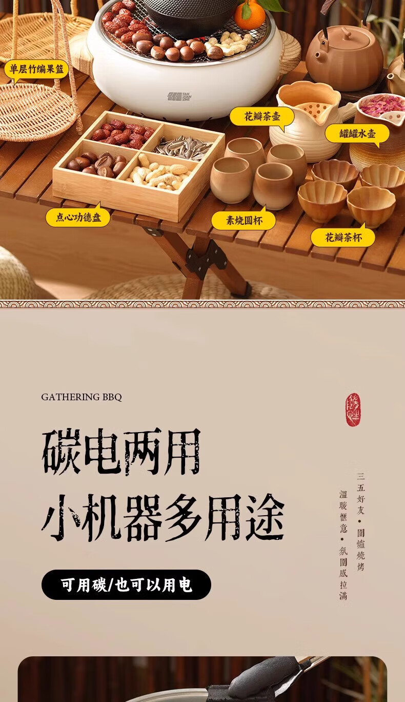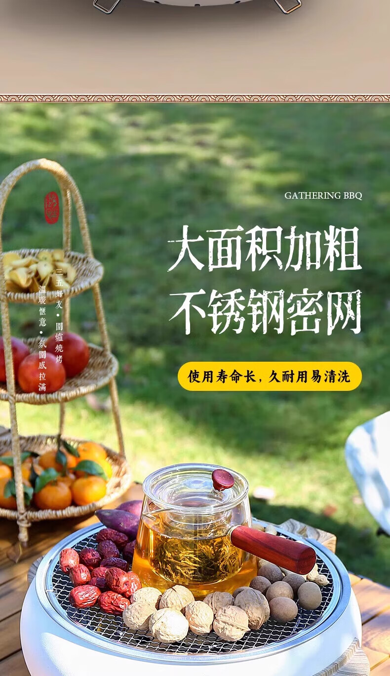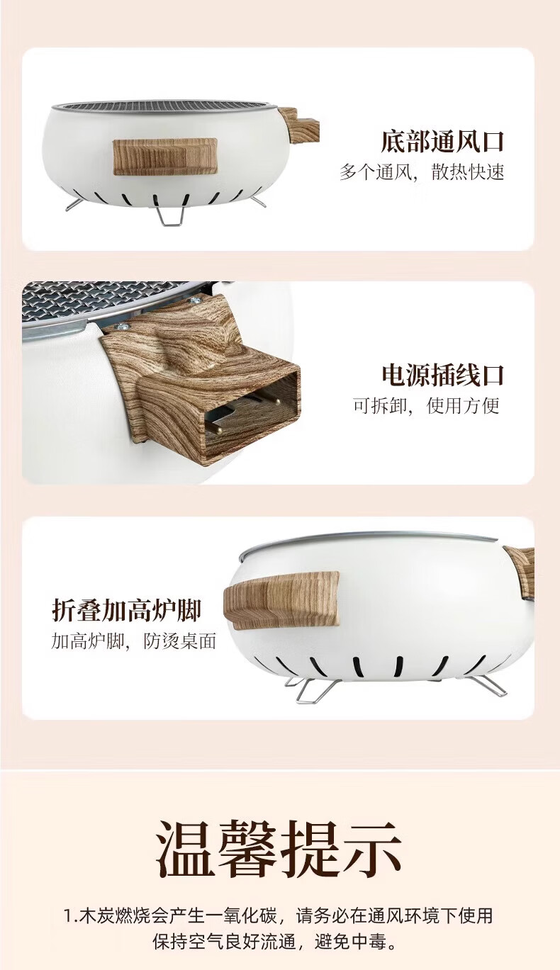桌子质感很不错,在户外应该会更出片,自己可以烧炭围炉煮茶,或者直接插电使用!挺好的,一家子暖暖的围着一起喝茶,在哪里都很方便,这次国庆就是用这个的还可以挺安全的家里也可以用户也可以用~