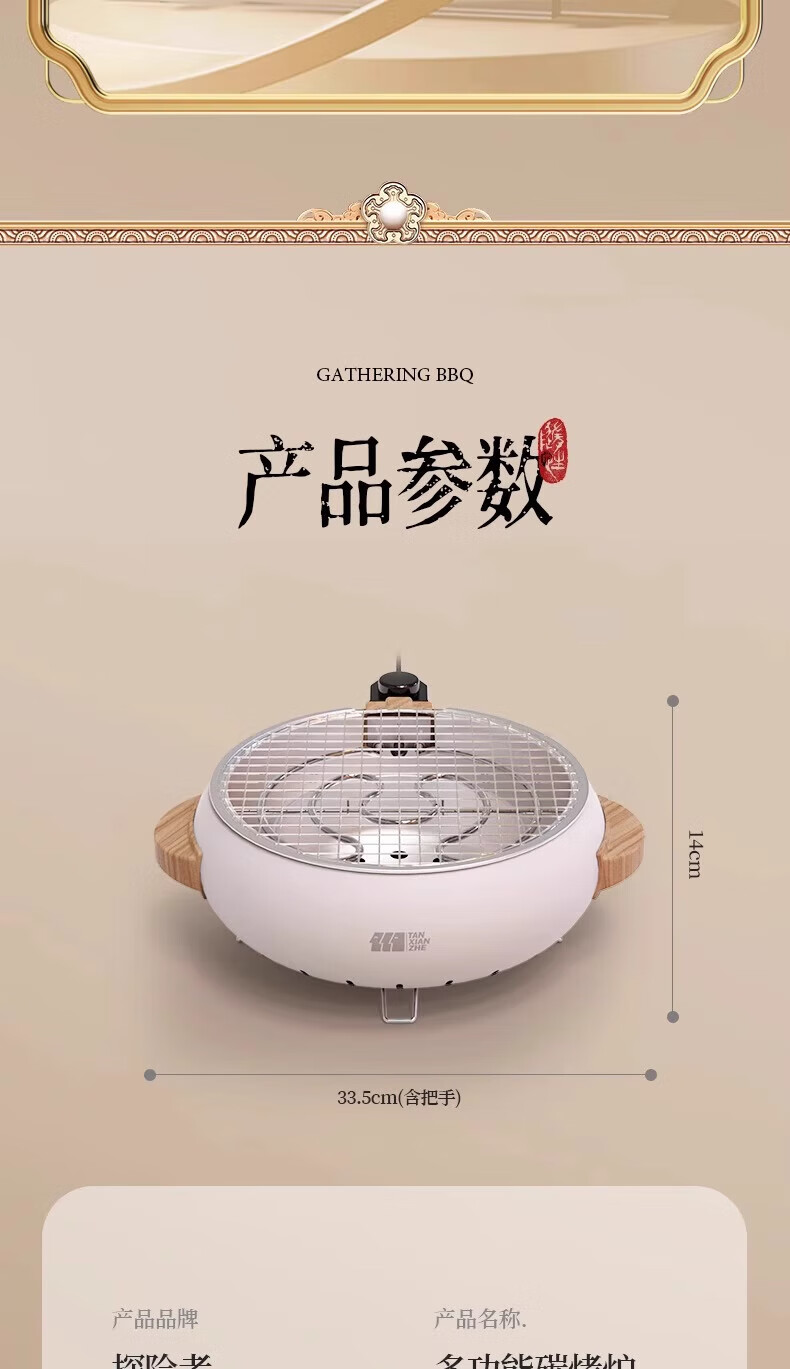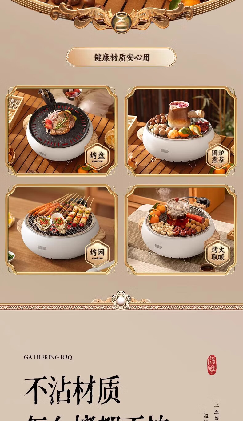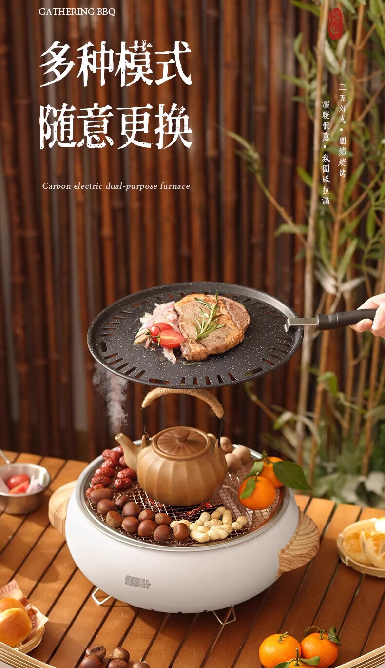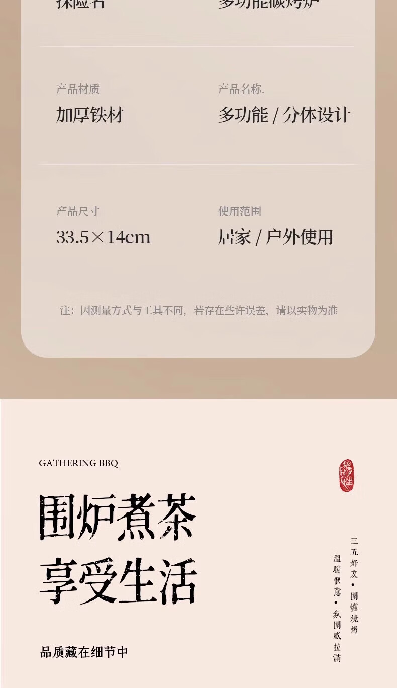 桌子质感很不错,在户外应该会更出片,自己可以烧炭围炉煮茶,或者直接插电使用!挺好的,一家子暖暖的围着一起喝茶,在哪里都很方便,这次国庆就是用这个的还可以挺安全的家里也可以用户也可以用~
