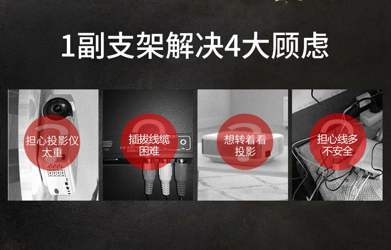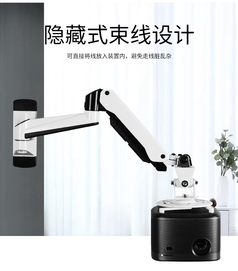 外观:非常漂亮,看上去就不是普通的支架,黑白投影仪都可以搭配。 性能:气压的,稳固性不用怀疑,调好后随意调节角度。不用损坏画质了。 其他:给大家提供一个暗线安装思路,可以把灯带拆掉,安装插座。射灯取下一个走线。