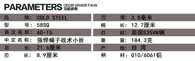 Coldsteel美国冷钢 新款58SQ AD-15 拉丝刃面 蝎子 战术刀 未开刃 户外工具刀 浅蓝色 默认1