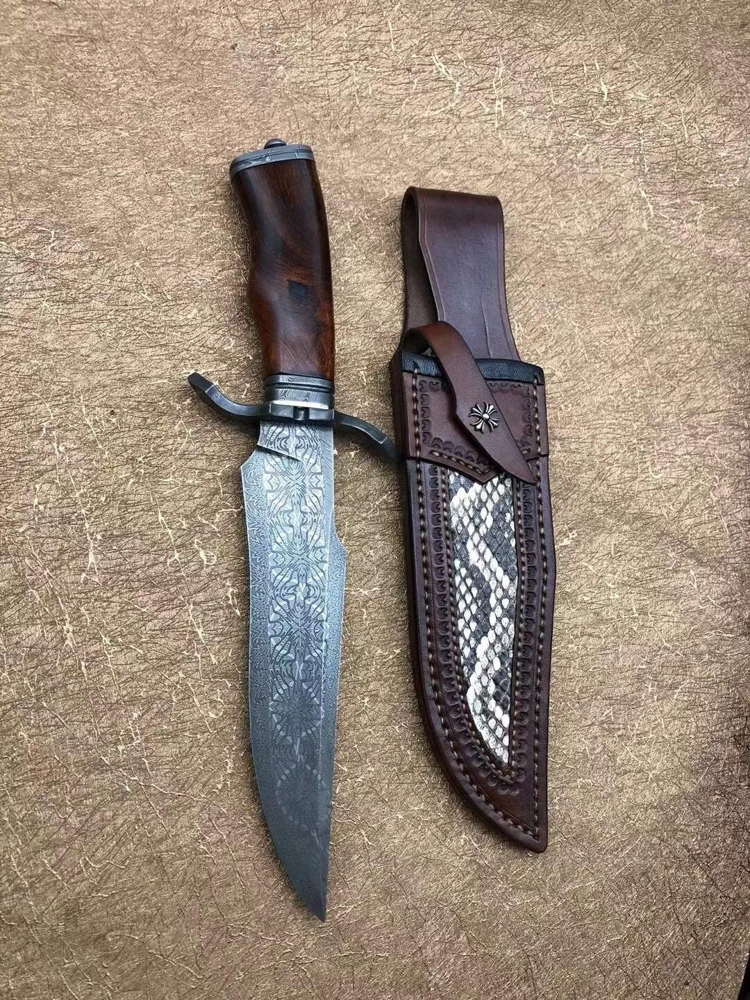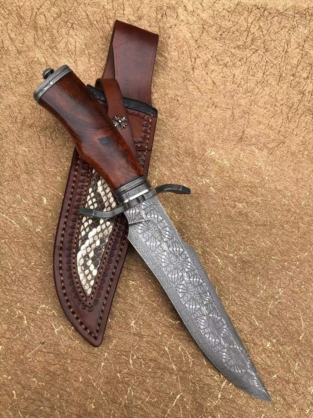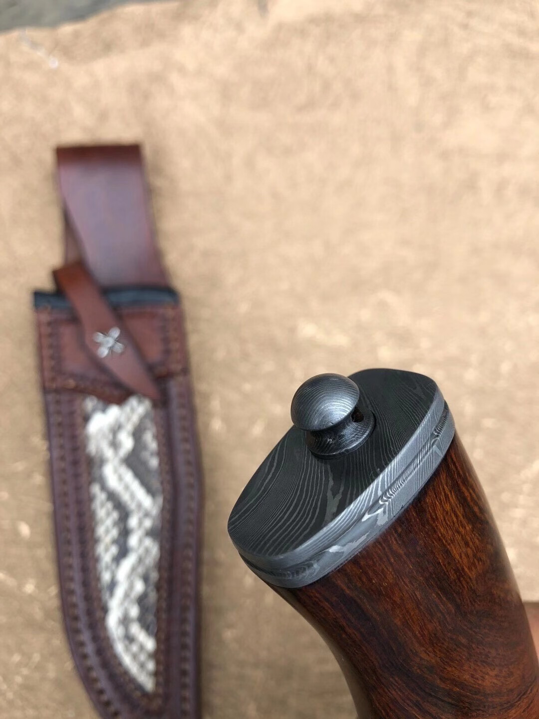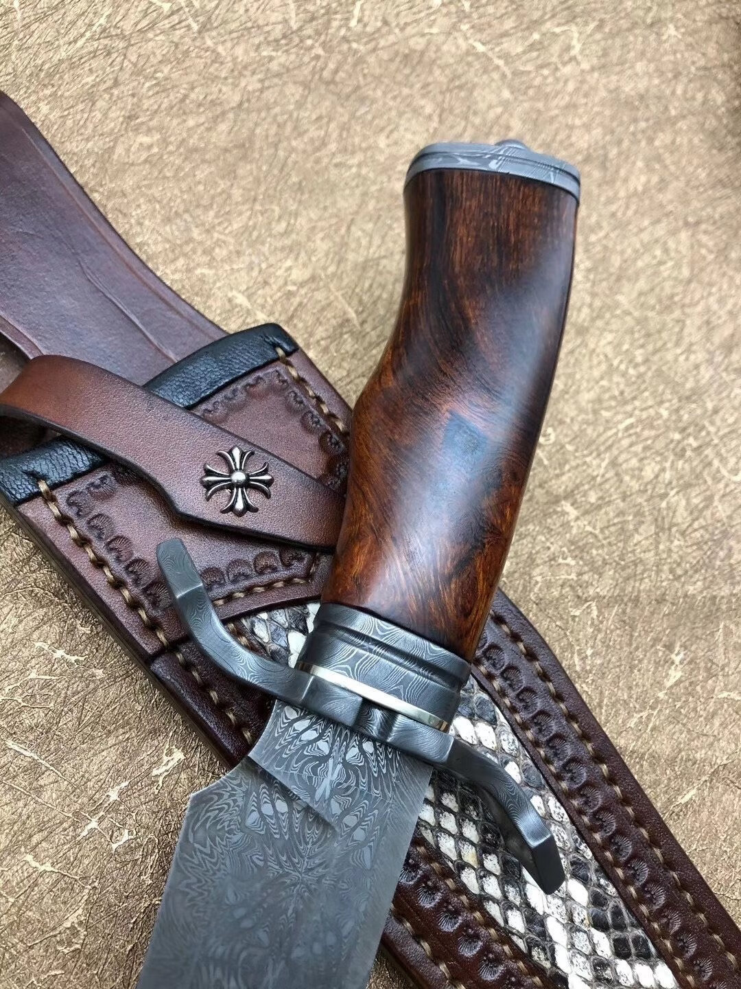雨轩户外拼接蛛网纹直刀大马士革钢刀户外小刀沙漠铁木手柄收藏送礼刀具