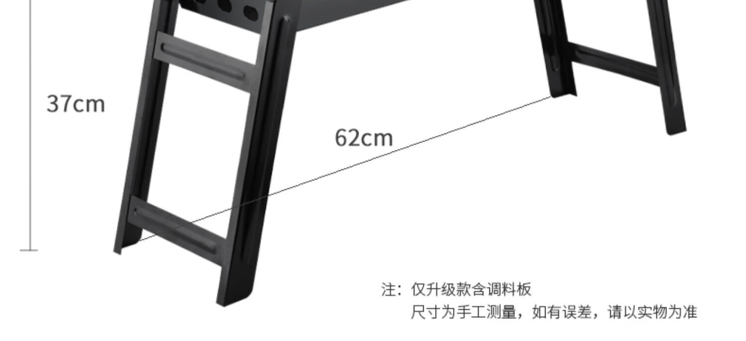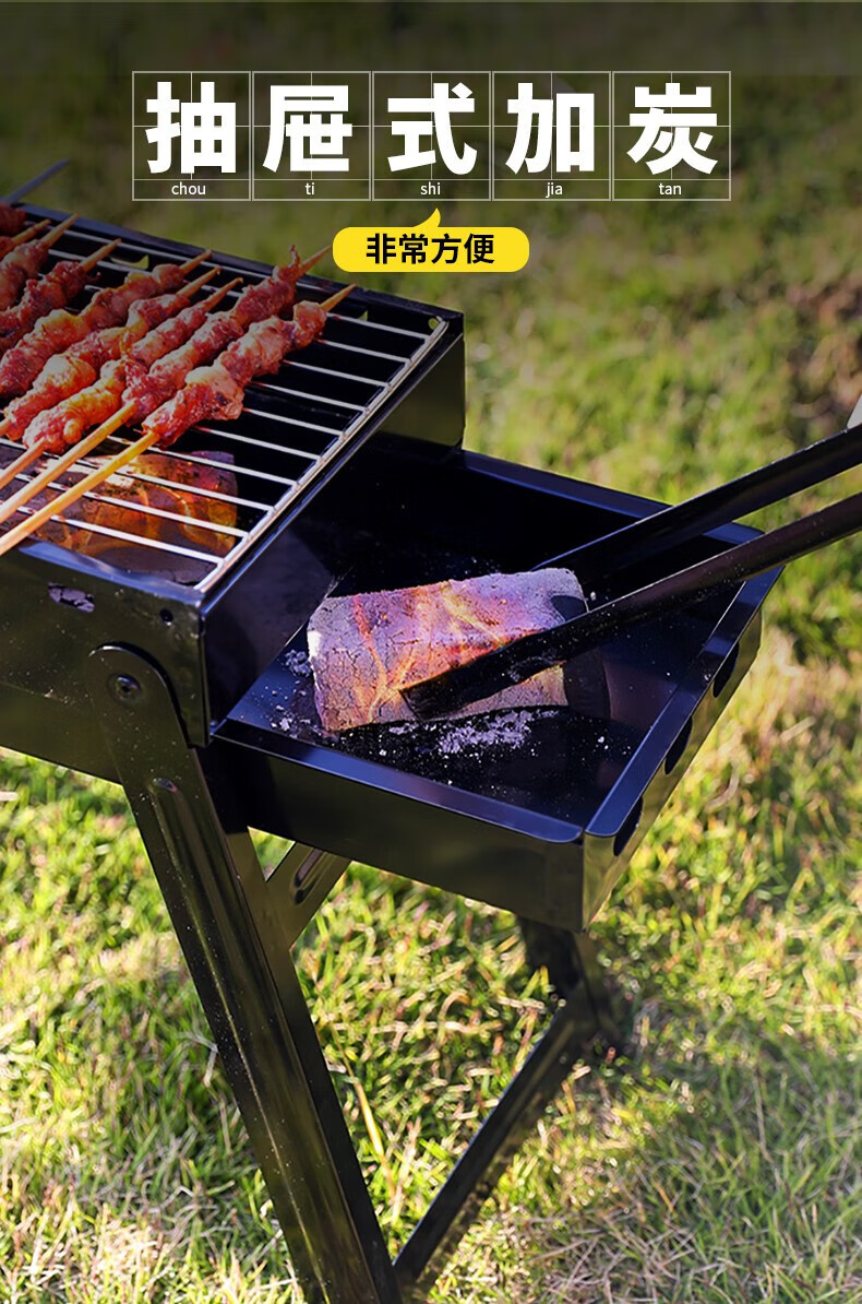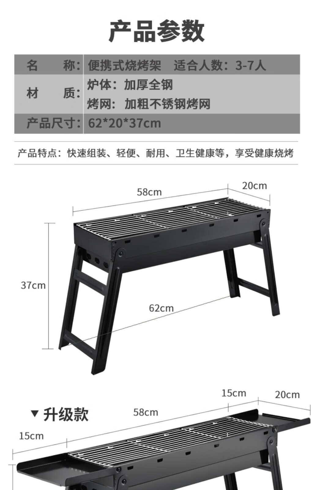 这款烧烤炉大小合适,高度适中。还可以在有条件的家里烧烤。2-3个人烧烤完全够用!还有一个收纳袋,提着烧烤炉方便野外烧烤。抽插的碳匣使用起来安全简便!