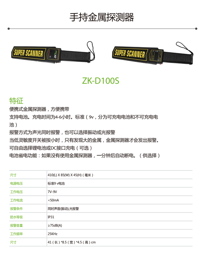 熵基ZKteco ZK-D100S手持金属探测仪 安检棒 金属探测器 高低灵敏度可切换 ZK-D100S标配