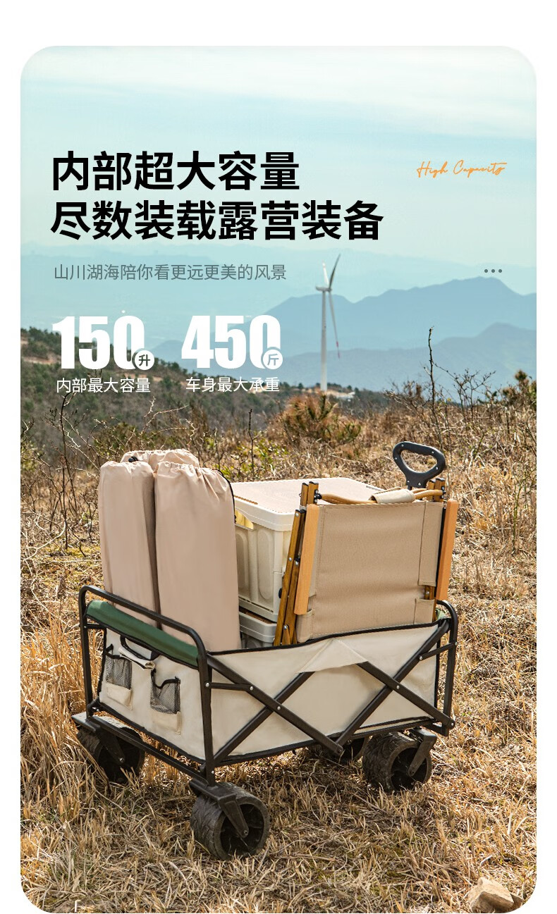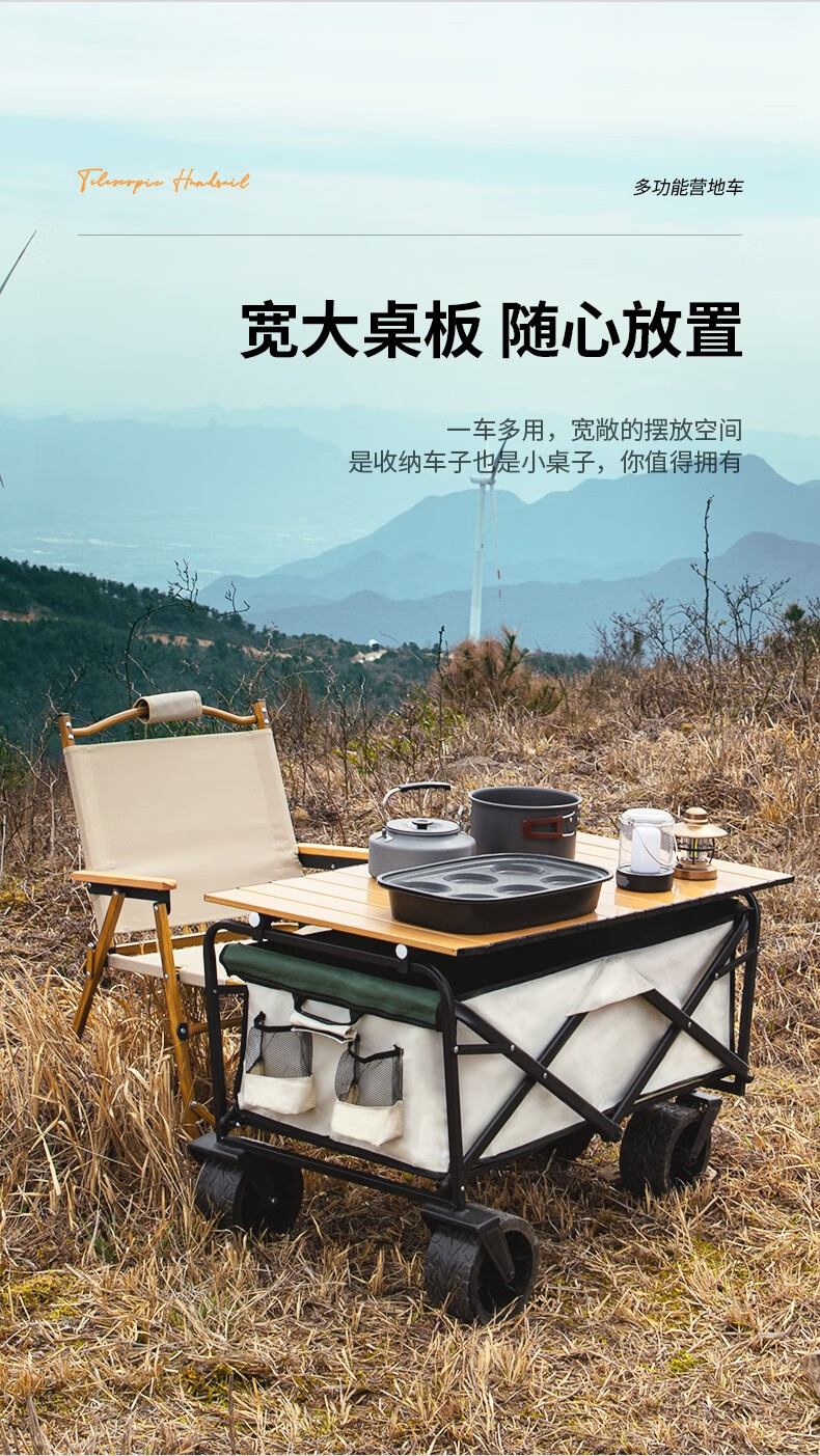Aoran露营推车可折叠户外手推野餐车营地拖车拉杆车桌板野营 【咖色150L】5寸平地窄轮