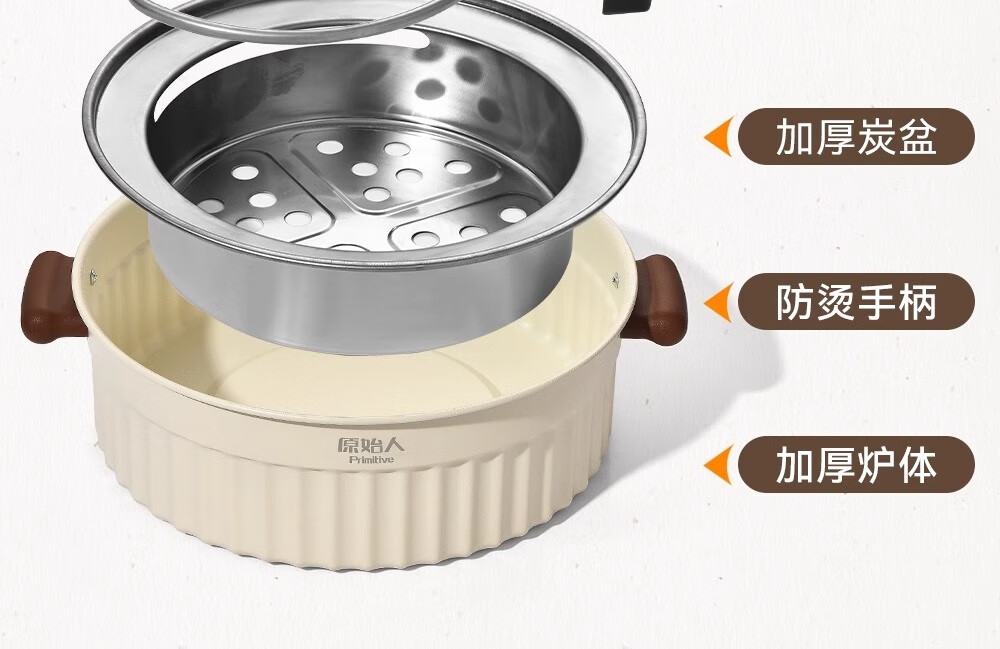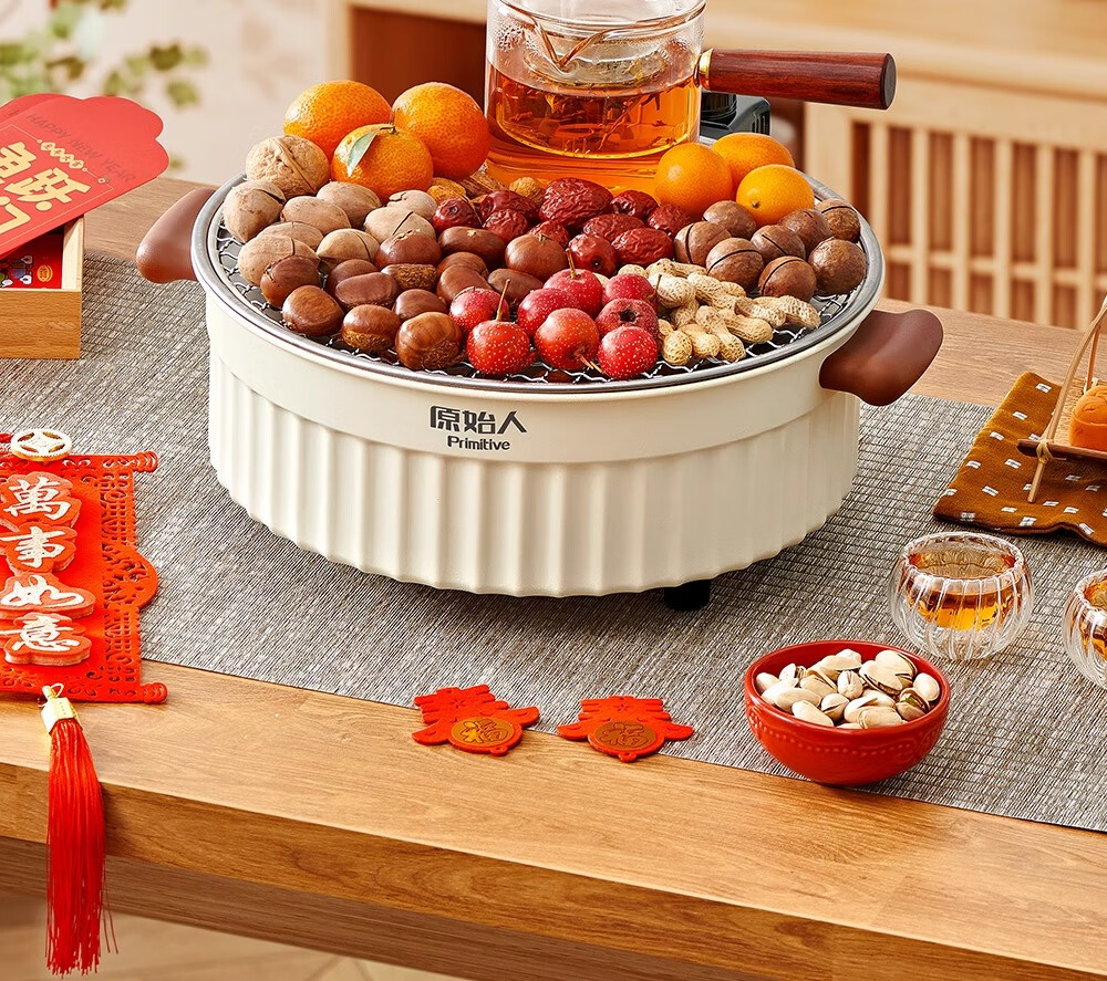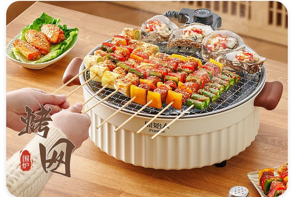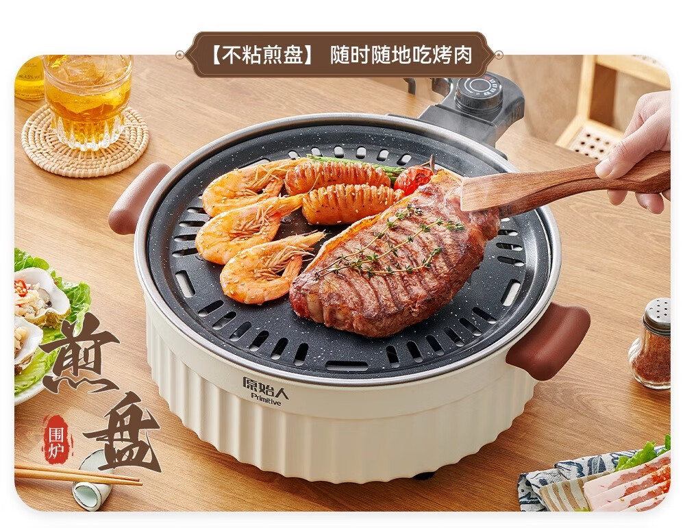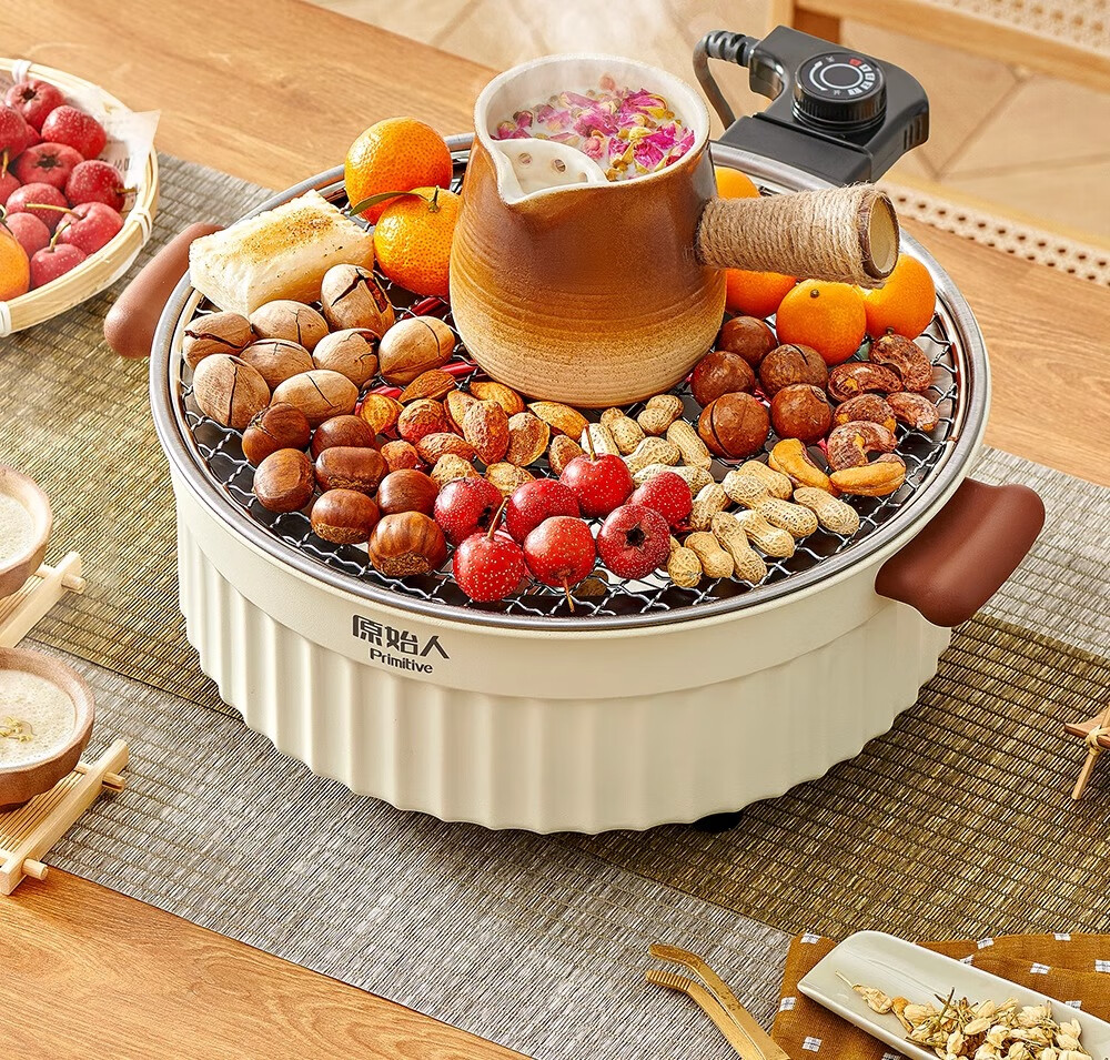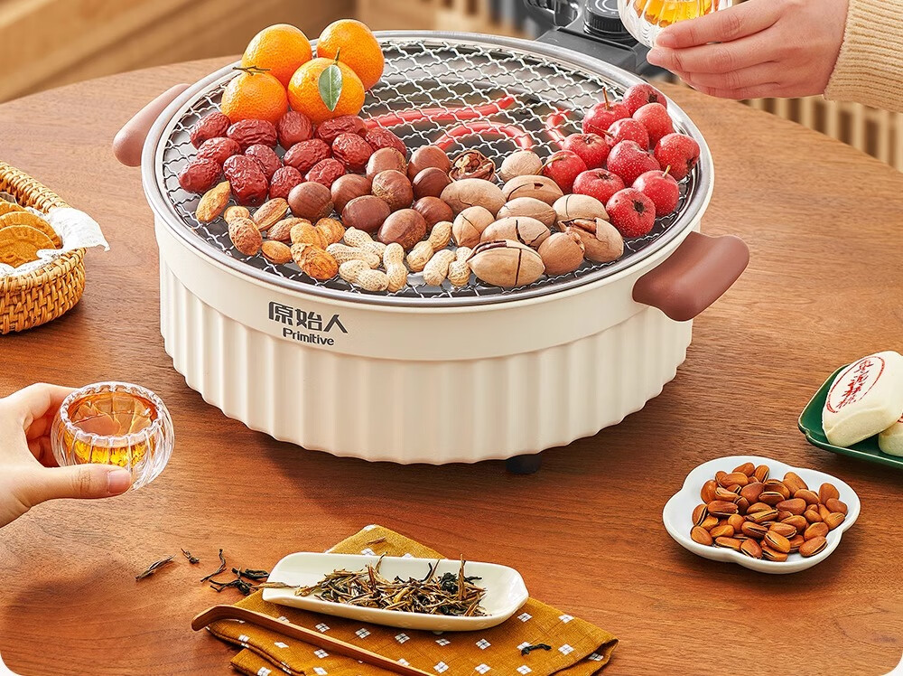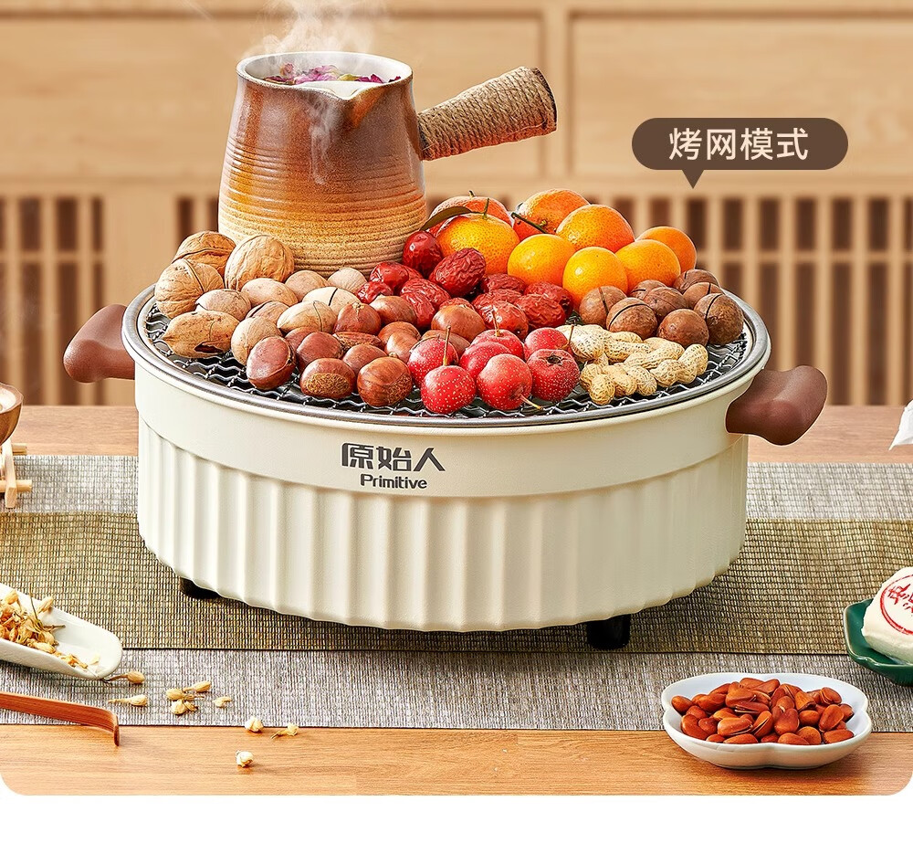 原始人2024新款电围炉煮茶家用室内无烟烧烤炉子烤肉烤火炉套装器具全套 米白煎烤套装(304烤网+煎盘)
