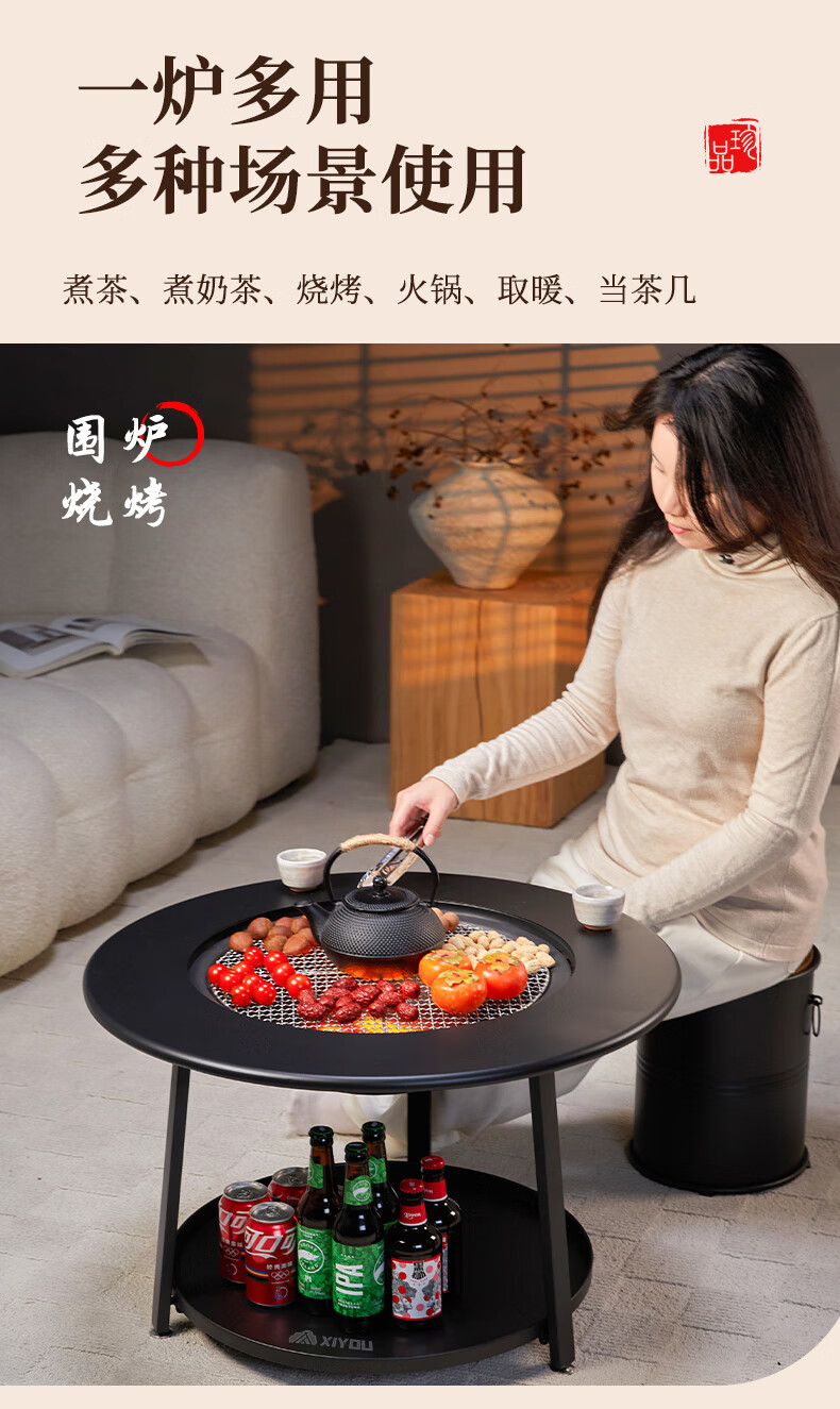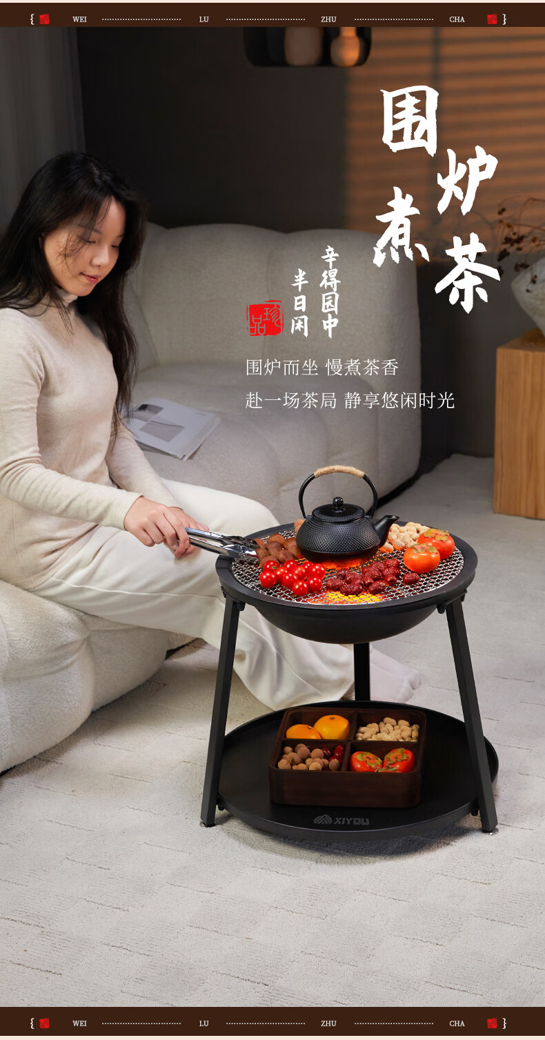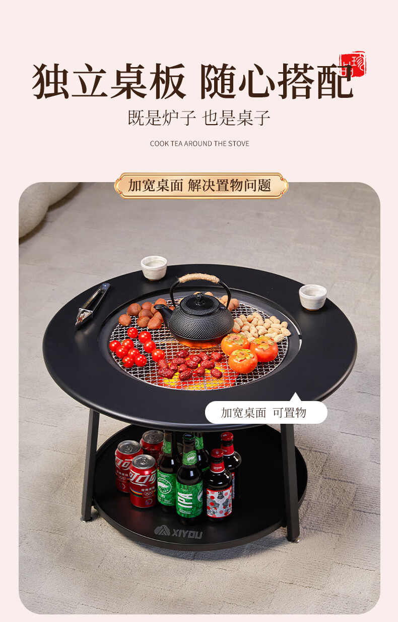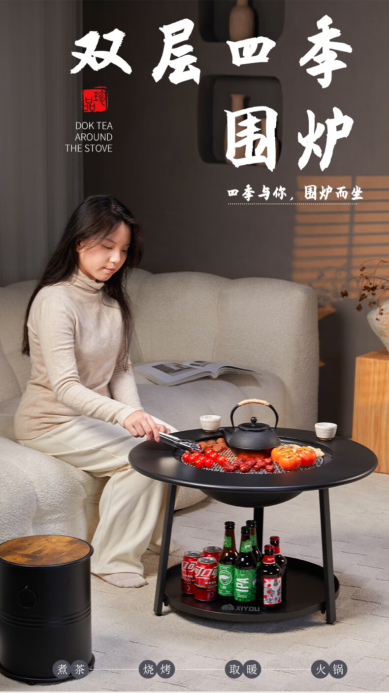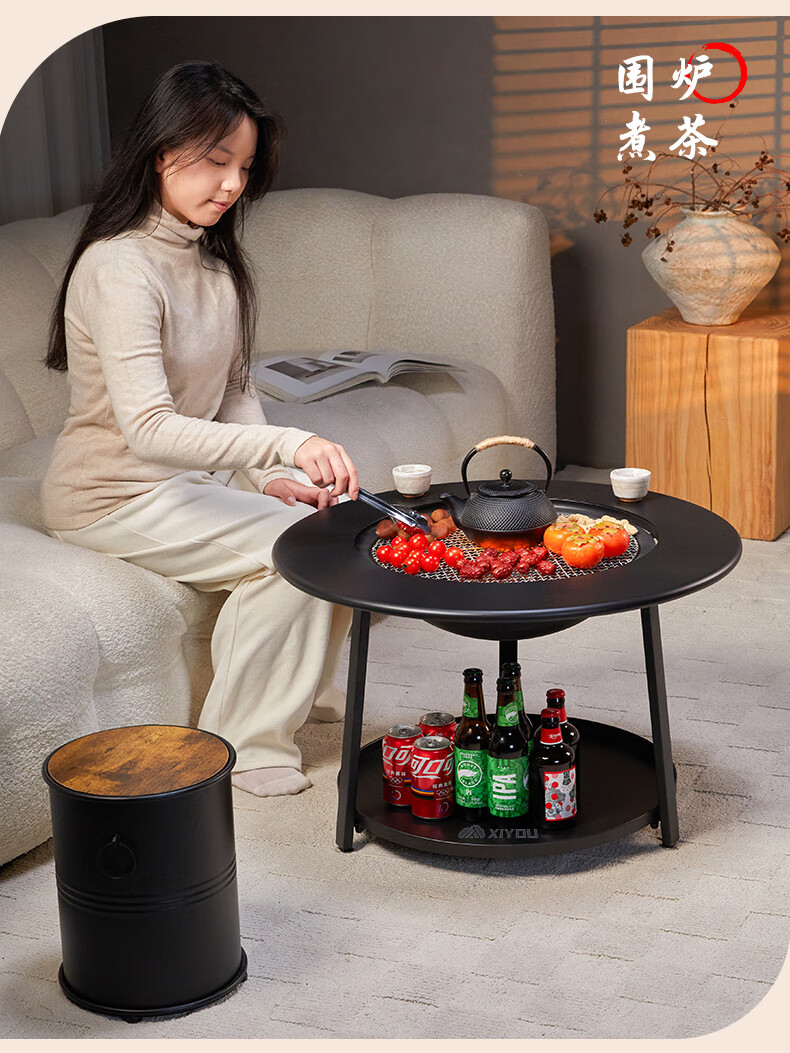嘻由围炉煮茶烧烤炉套装多功能烤肉火炉户外庭院烧烤架家用无烟煮茶炉 【双层围炉煮茶桌标准版】