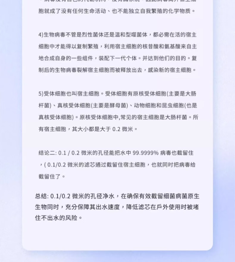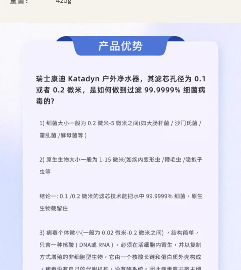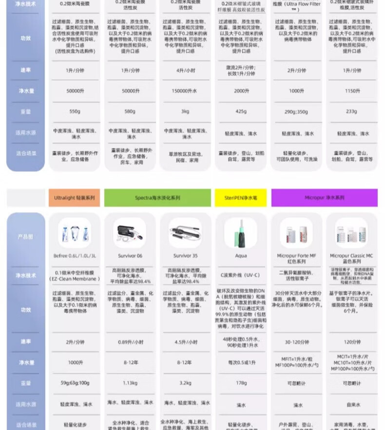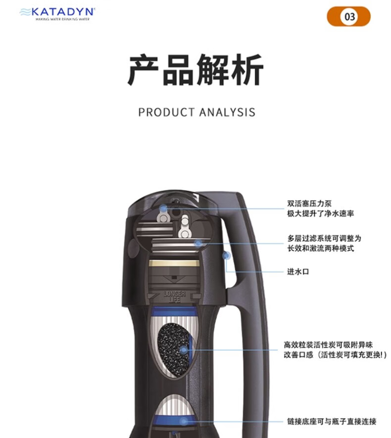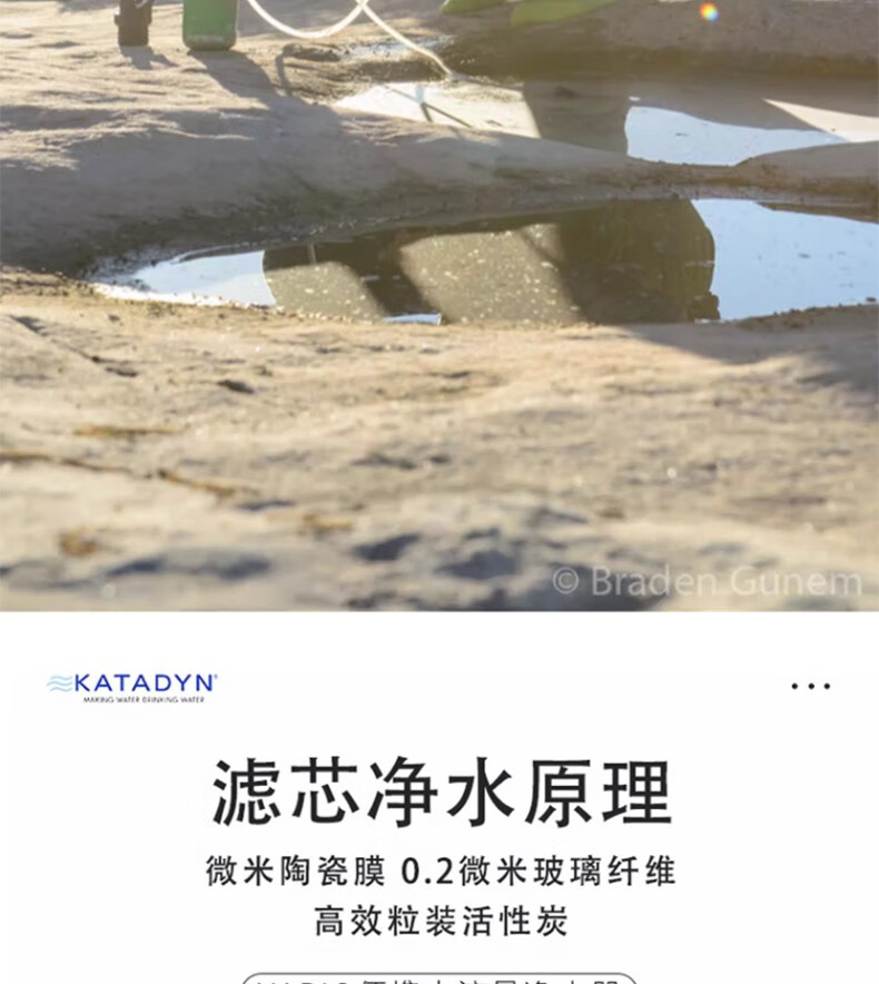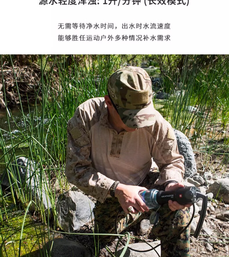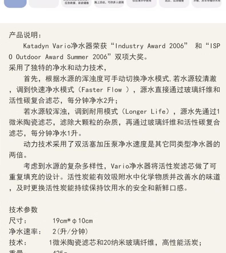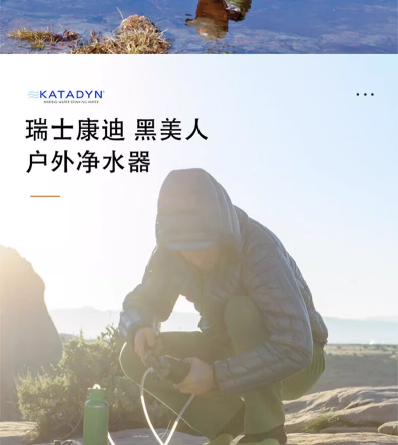 收到后先按照说明书上的介绍进行了试用 ,中午说明书的讲解比较简单,买家可以录制一段使用教程视频来帮助用户更好的使用。关注这款产品一段时间了,做为家庭应急准备的重要物资购置。康迪是户外净水设备中比较知名的 。这次也同时购买了康迪的净水药片。 这款作为康迪产品中性价比较高的产品有着三重过滤系统,活性炭的吸附能力可以改善净化后水的口感。加上康迪的净水药片以及煮沸之后就可以获得安全的饮用水了。