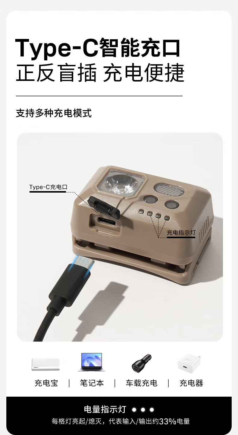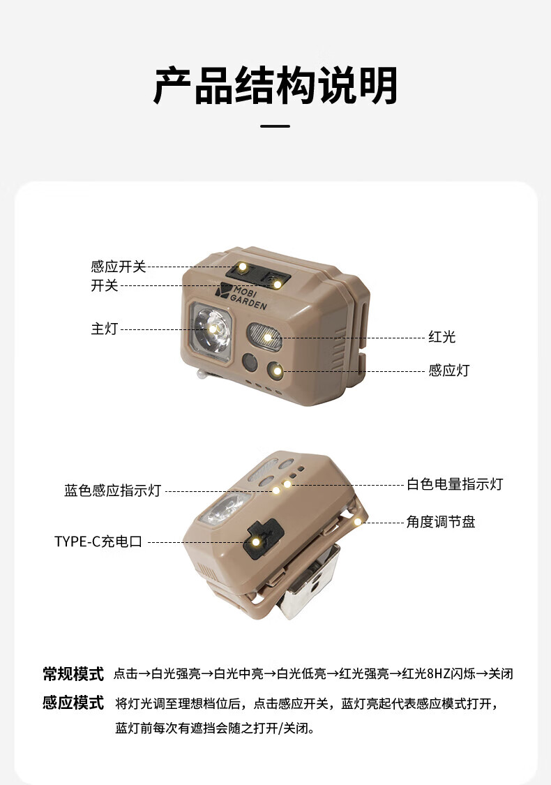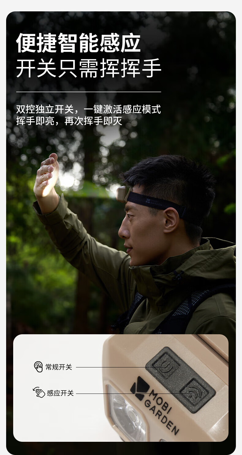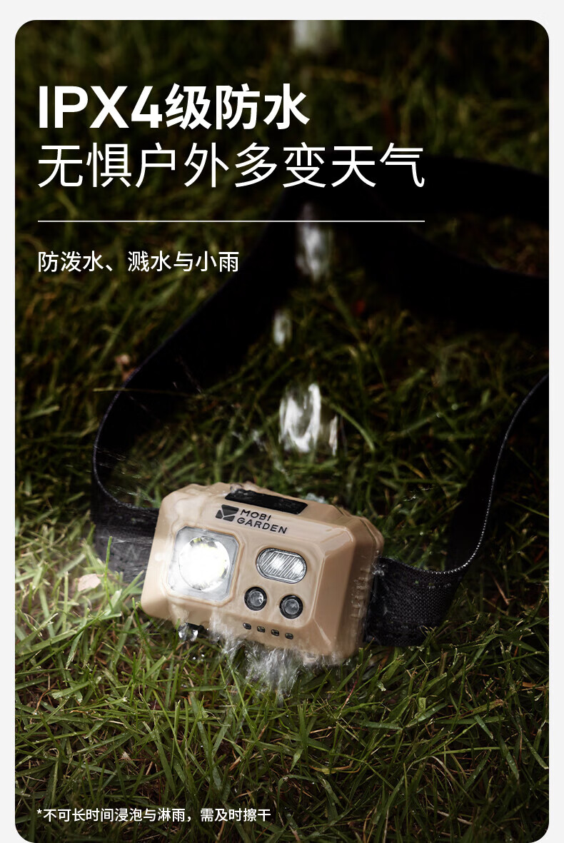 牧高笛户外露营头灯超轻便携式头戴登山钓鱼感应充电零度头灯 沙石色