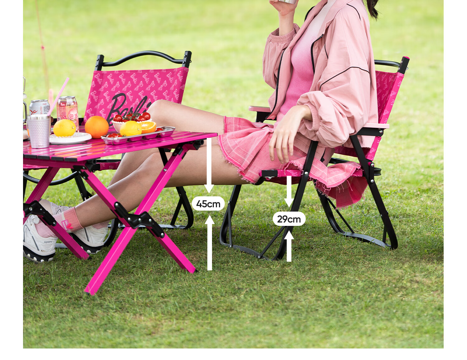 颜色很鲜艳无色差,椅子高度足够坐着很舒服,收纳也很方便便捷,不占地方,比较轻,也比较结实,坐着不会凹陷,芭比联名很漂亮,喜欢