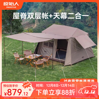 原始人户外黑胶帐篷天幕二合一便携式露营折叠屋脊野营过夜防暴雨装备 屋脊双层帐-一体式速开支架