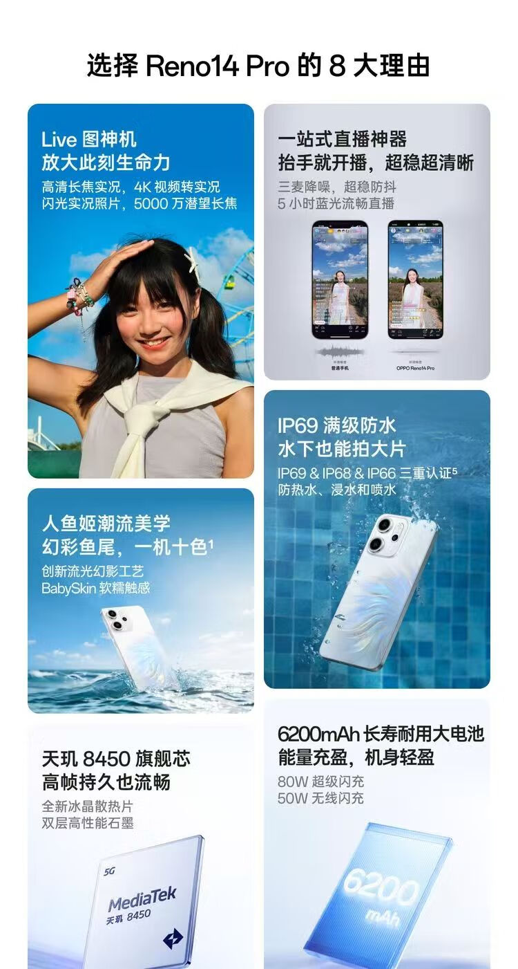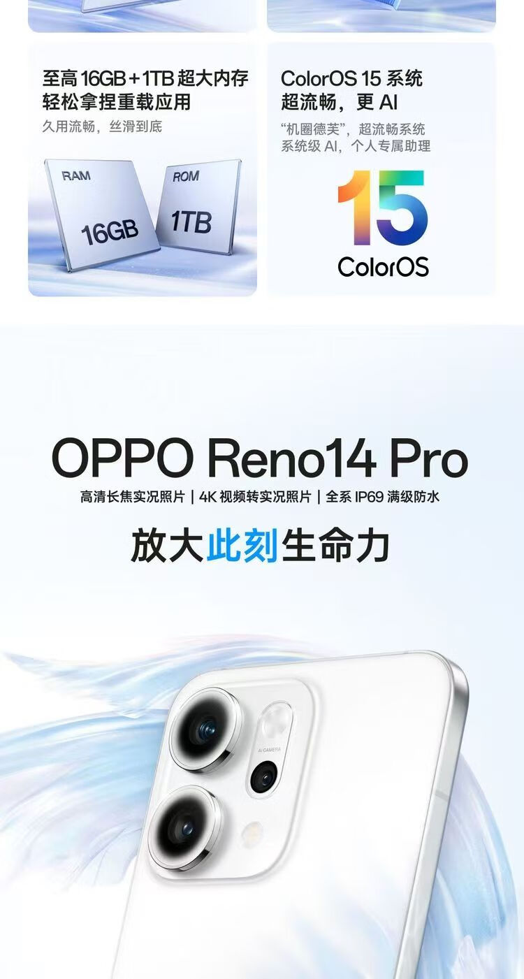 OPPOReno14 Pro 直播神器 高清实况照片展机 人鱼姬潮流配色 IP69防水 礁石黑 16GB+1TB 单机+原装快充+店保一年