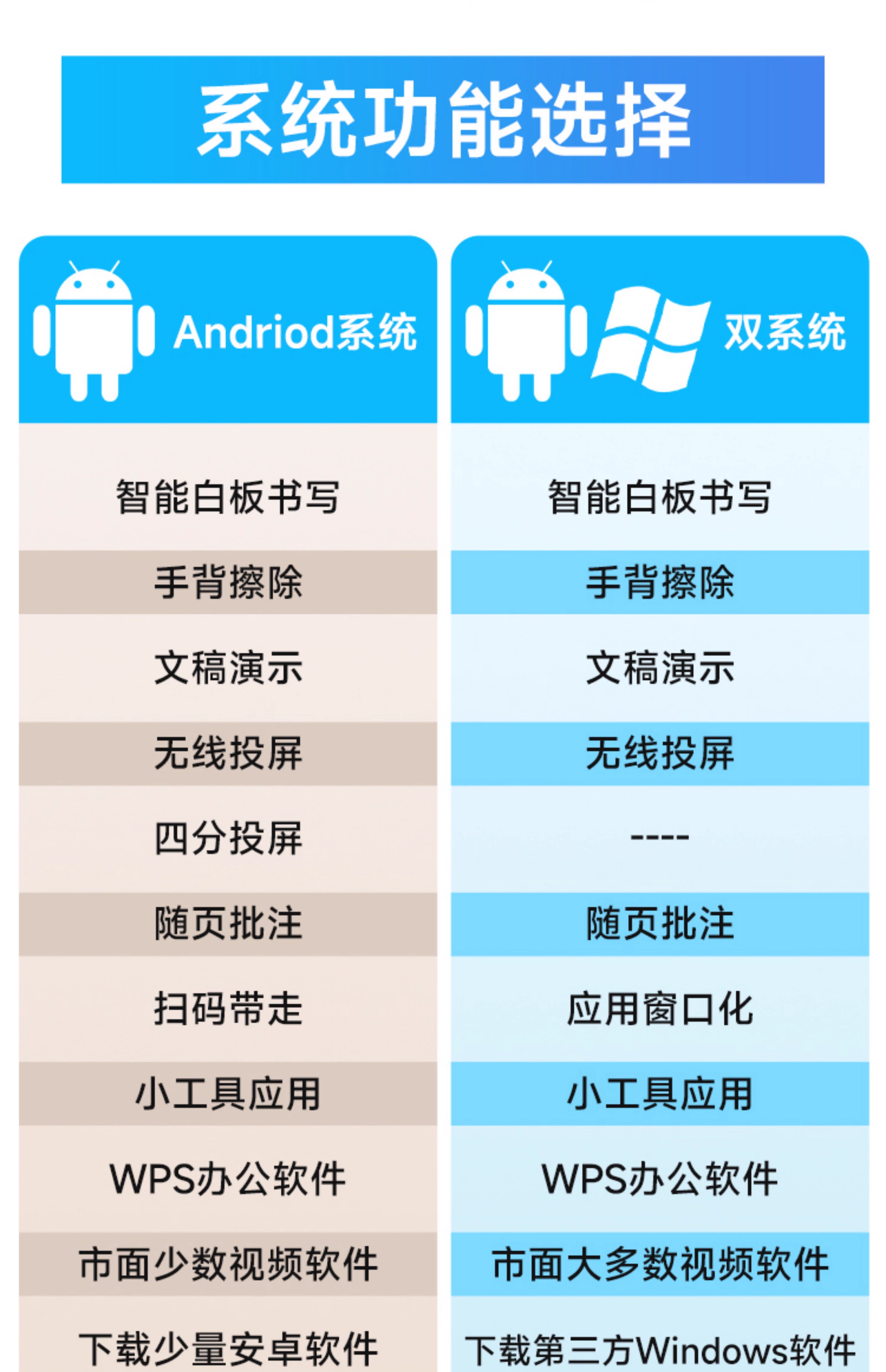 整体评价:运行速度快,不卡顿,双系统切换自如,触屏灵敏 功能设计:window 系统与电脑一样,安卓系统投屏很方便,教学及作品评比用起来非常便捷 外观款式:一体机不占地方,外观像电视一样 运行速度:运行速度快,教学很方便