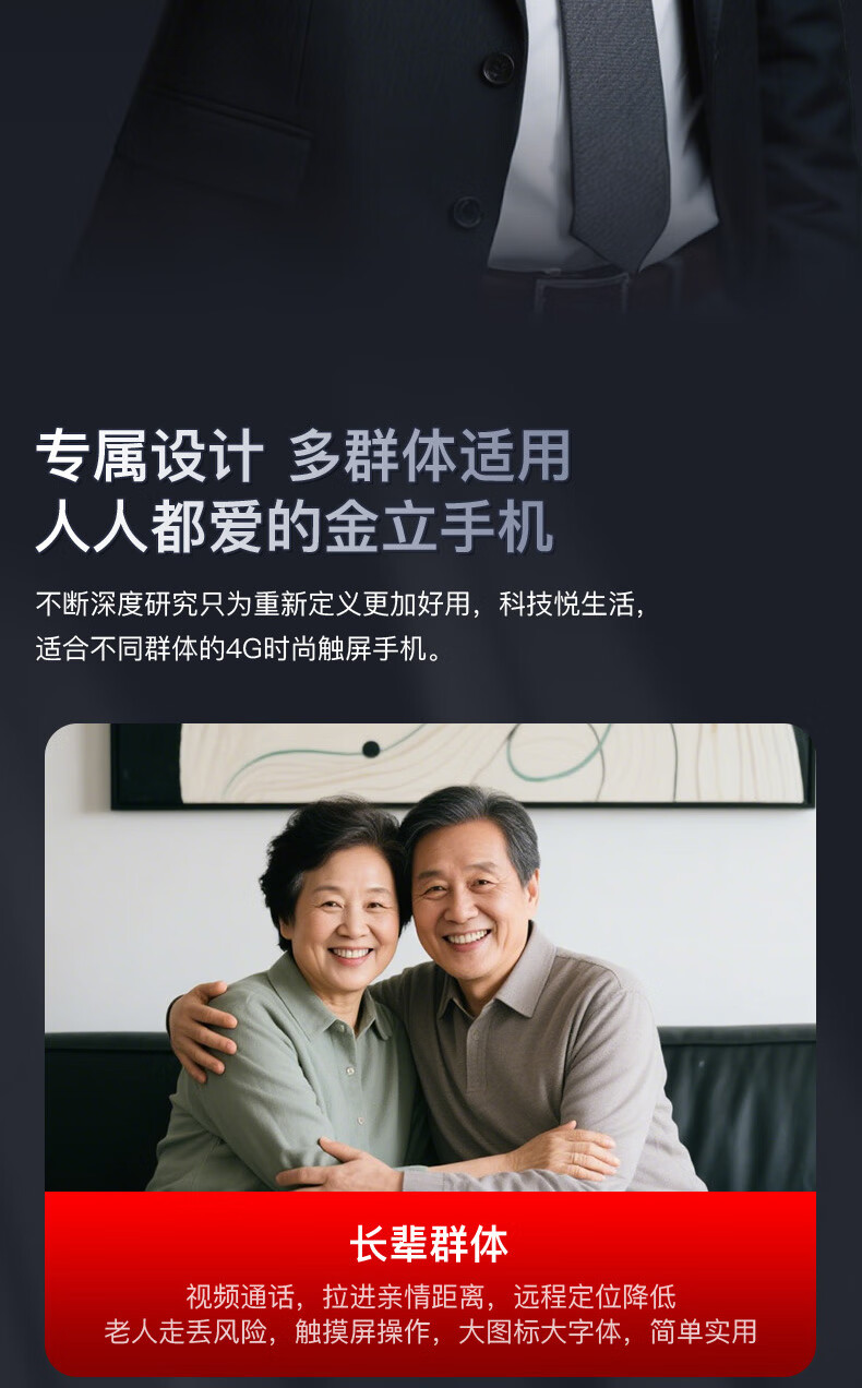 给老人买的手机金立牌子也很熟悉了 手机声音大 适合老人 还有亲情号码设置 对老人很友好 适合老人用 买老人手机第一时间想到了金立 价格也很合适 用到现在很不错呢