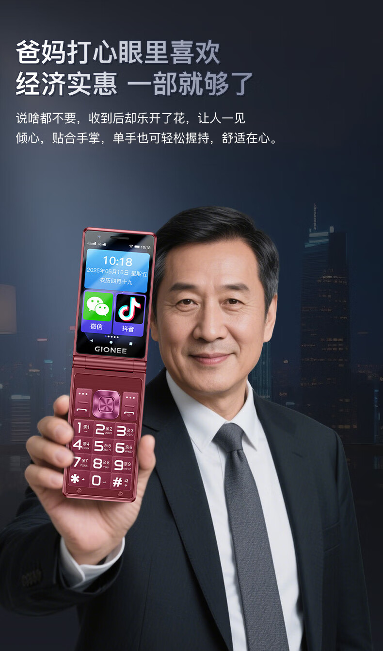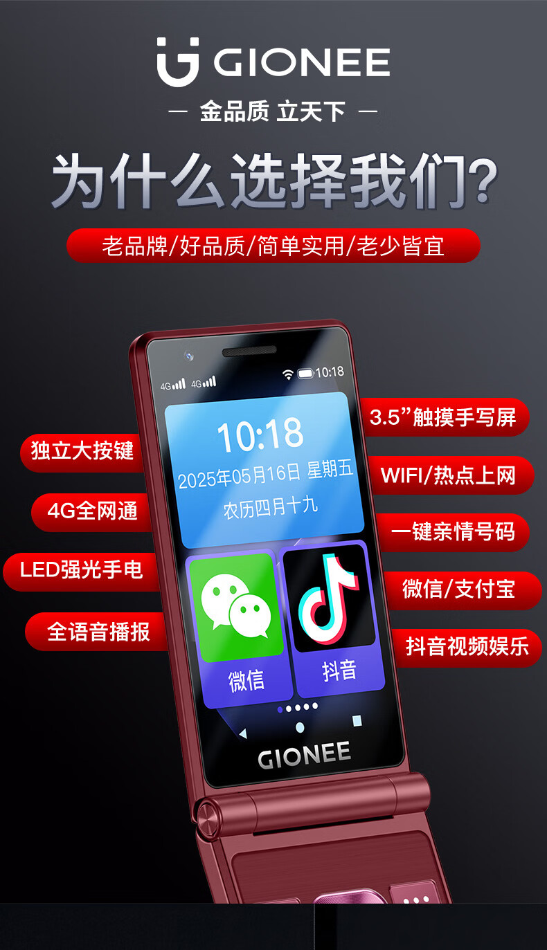 金立老品牌了,这款翻盖老年人手机,音量洪亮,穿透力强,大字体按键,操作简单,老人一学就会,电池容量够大,超长待机满足日常使用需求。手机带有抖音,老人没事的时候刷刷视频,很满意。