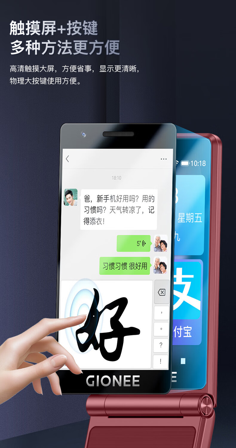 丈母娘的手机坏了,给她老人家选购了这款翻盖红色金立v16D手机,老人非常喜欢,声音大,续航时间长,省的老是充电。手机数字按健大而且字体非常清晰,按键和触摸屏的,使用方便。价格也非常划算,好评!