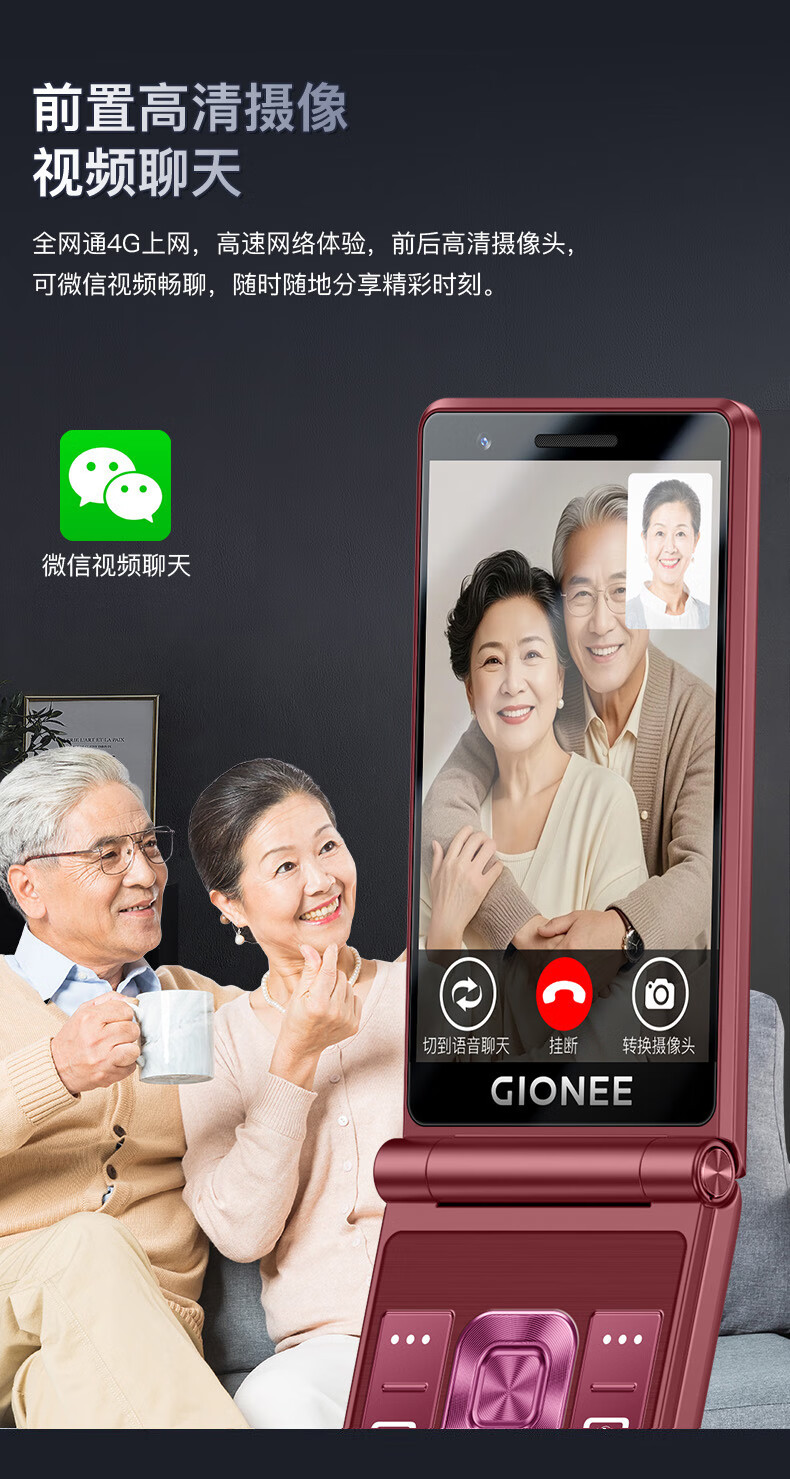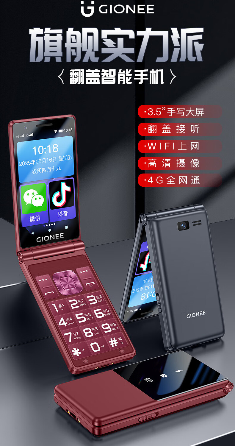 金立翻盖老人智能手机3.5英寸微信可视频抖音按键触摸屏长续航老年机4G全网通双卡双待学生备用 红色 32GB【微信智能版-标配版】