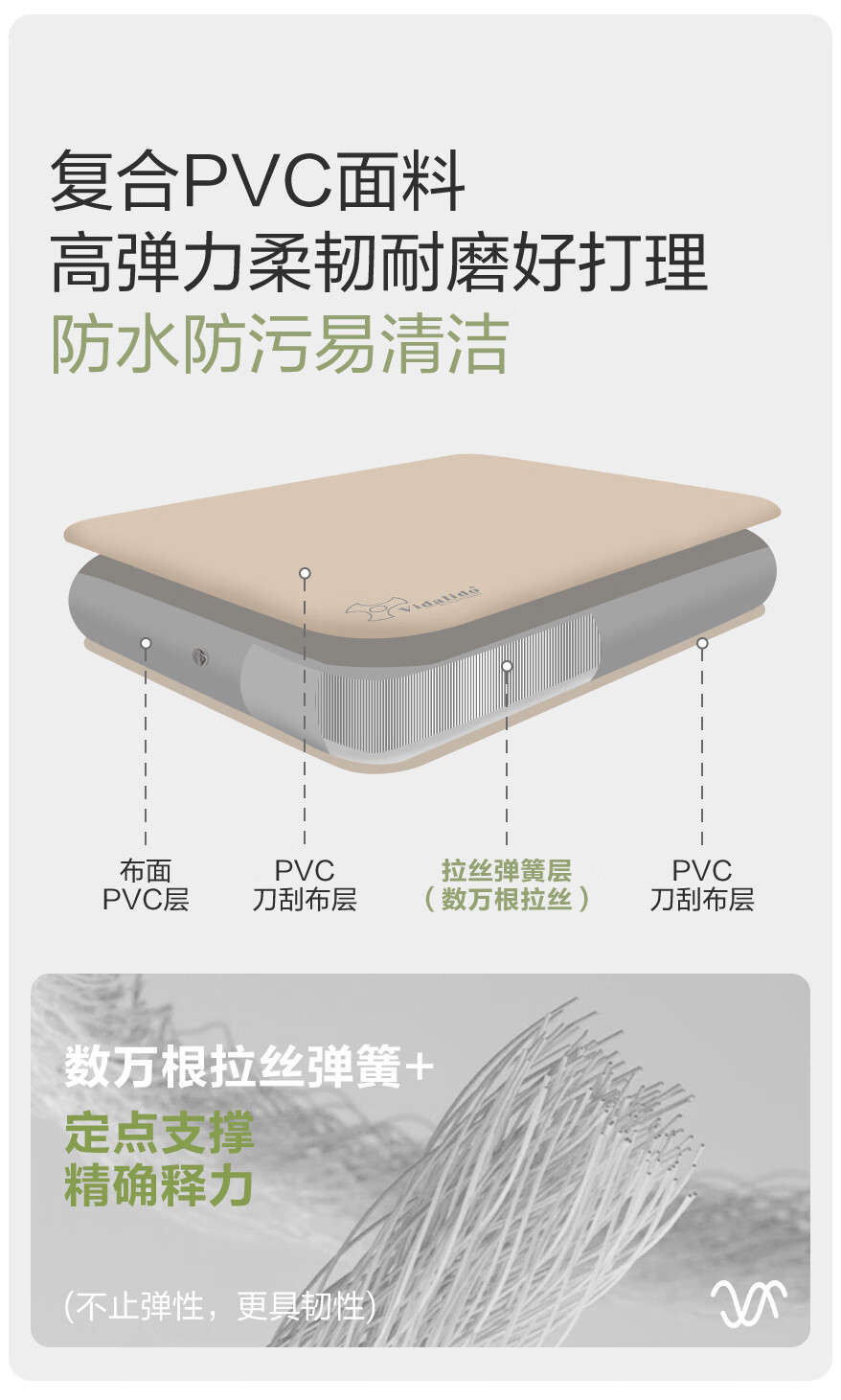 维达利多这个拉丝床垫充气充了10几天了一点气都没跑,一直犹豫买tpu还是pvc的,后来看评论如果不是在极寒地区,pvc的够用,tpu在某些情况下会分解等问题。