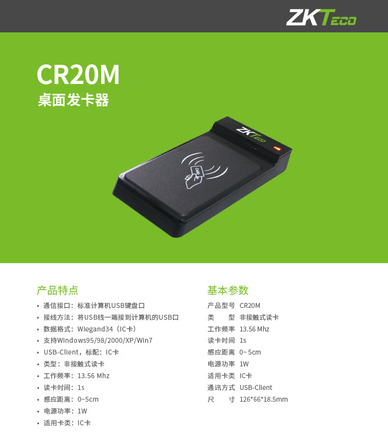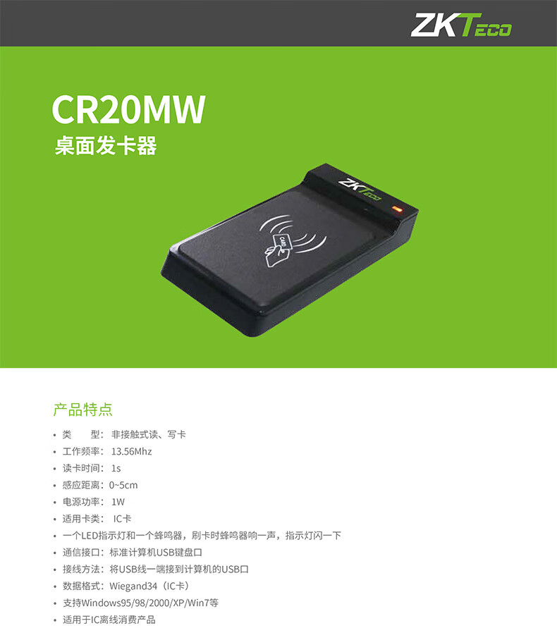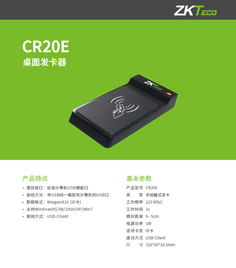 ZKTECO 熵基科技CR20M CR20E CR20MW发卡器考勤机消费读卡器打卡机ID卡IC CR20E(读ID卡、考勤门禁用)