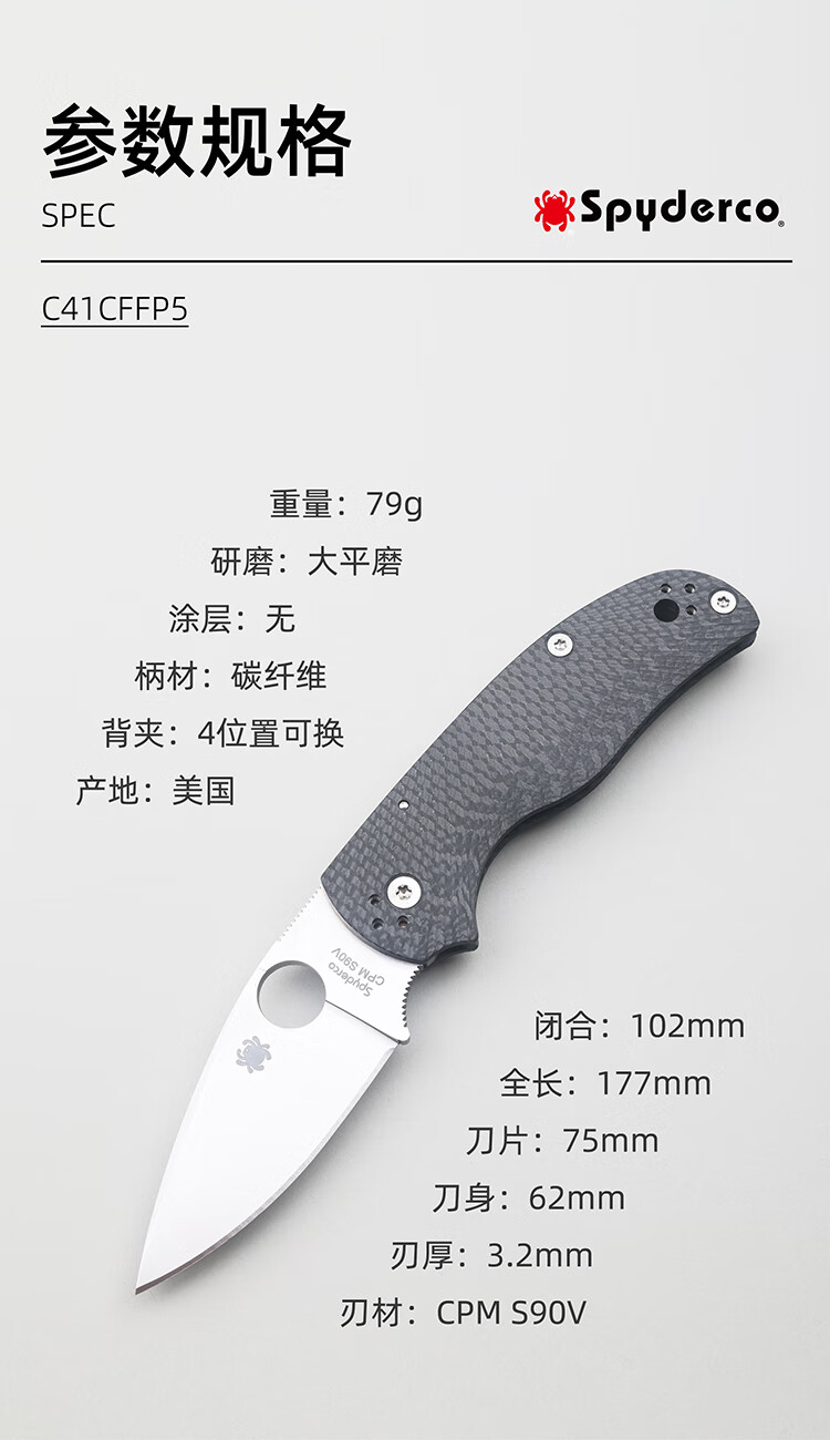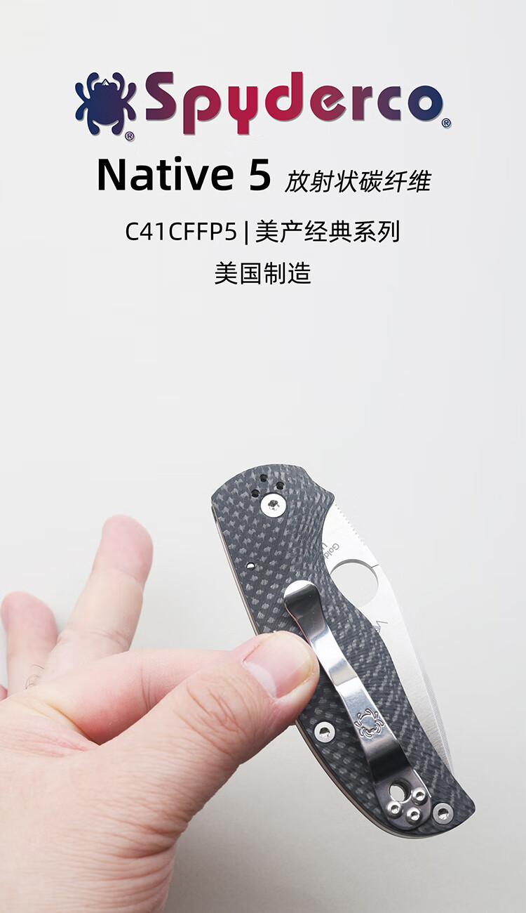 SPYDERCO美国蜘蛛C41CFFP5 Native5户外便携折刀碳纤维S90V不锈钢 C41CFFP5 60°以下 102mm 6.2cm