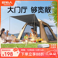 原始人帐篷户外露营便携式防雨加厚折叠自动野外露营装备全套野营过夜 钛黑胶卡其两门两窗款+门厅杆