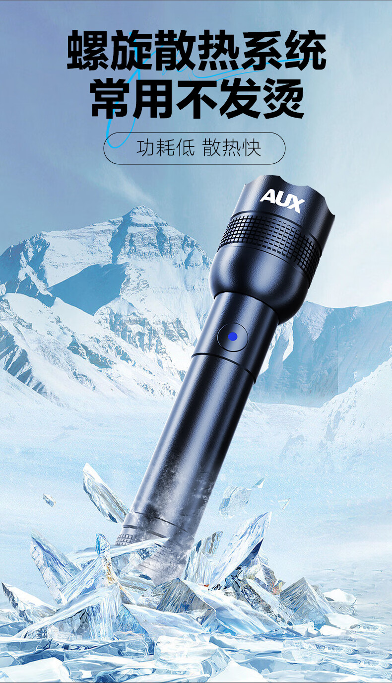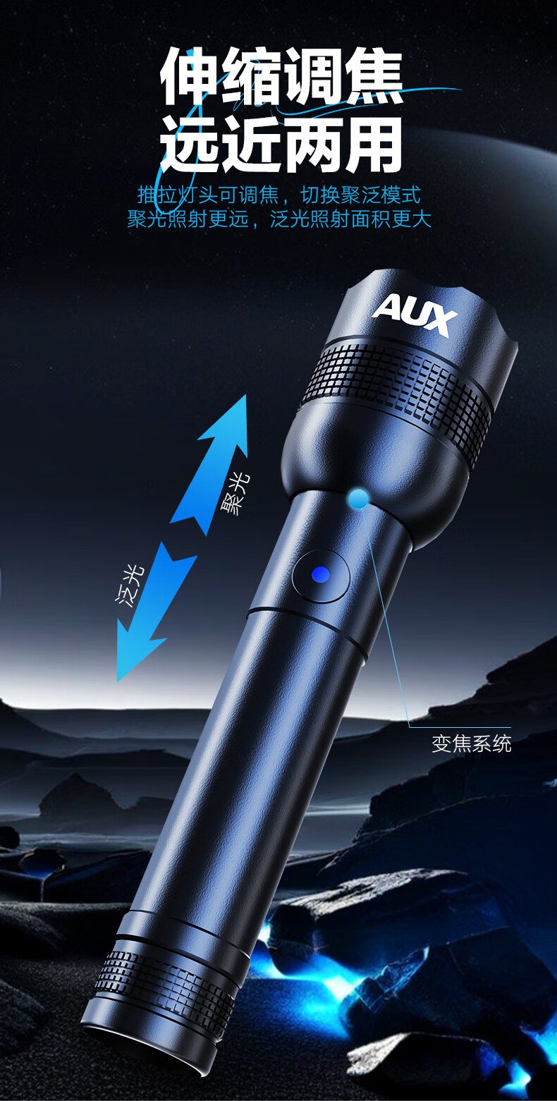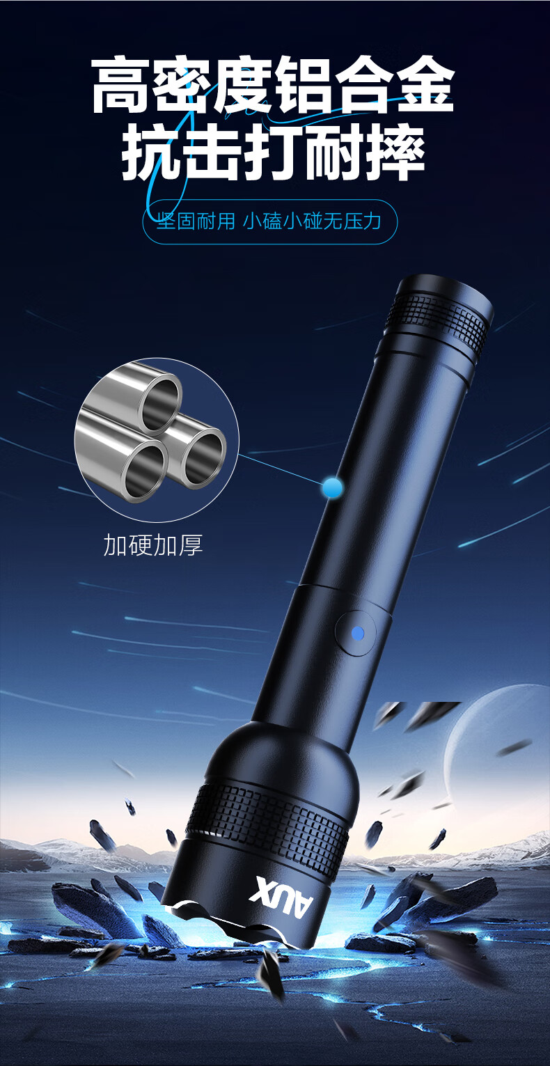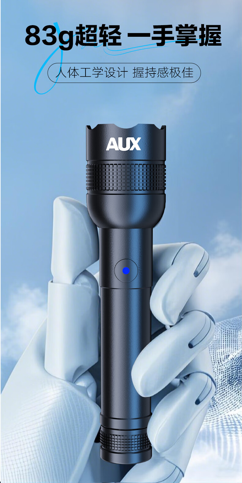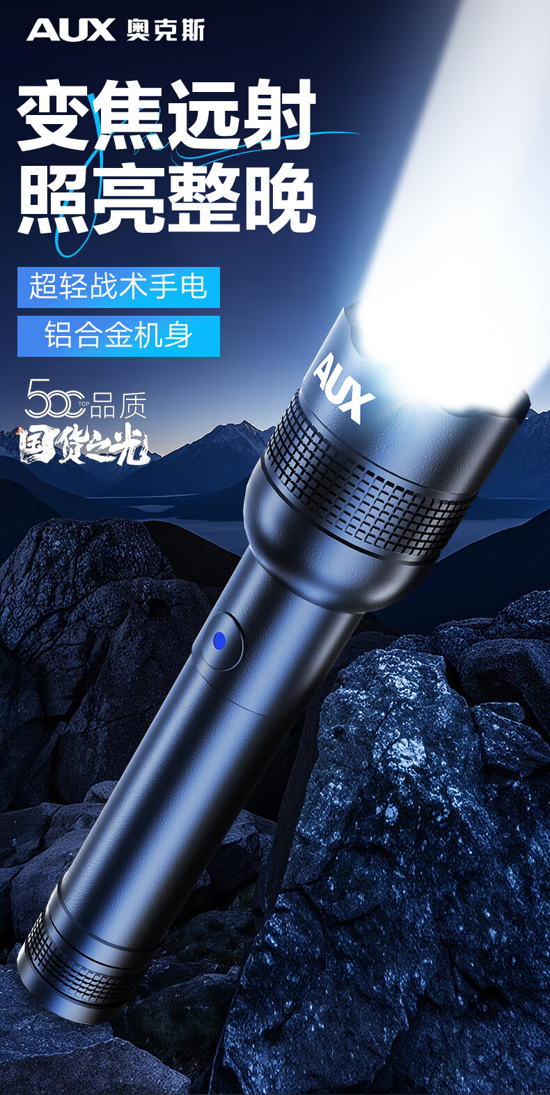 奥克斯(AUX)手电筒强光超亮长续航变焦远射军小型家用应急巡逻 铝合金+快充+变焦+两节电池