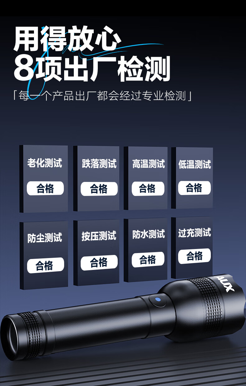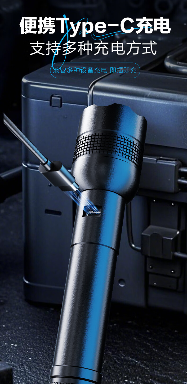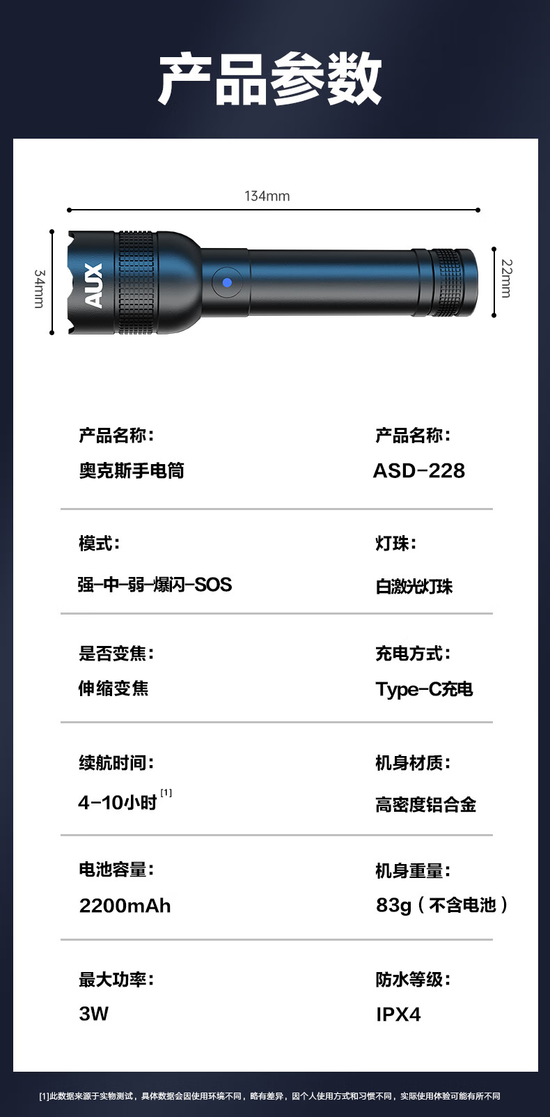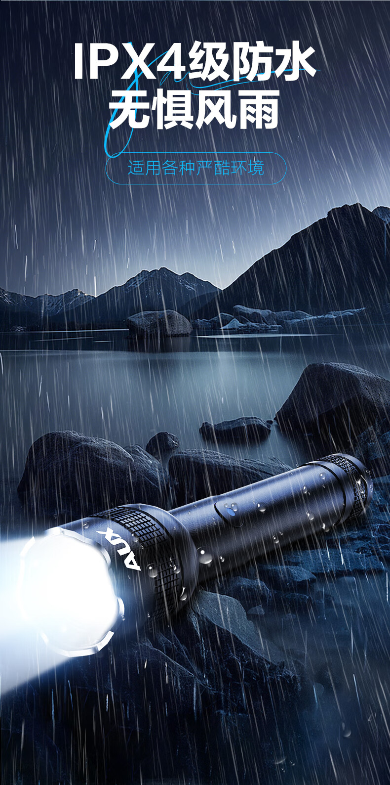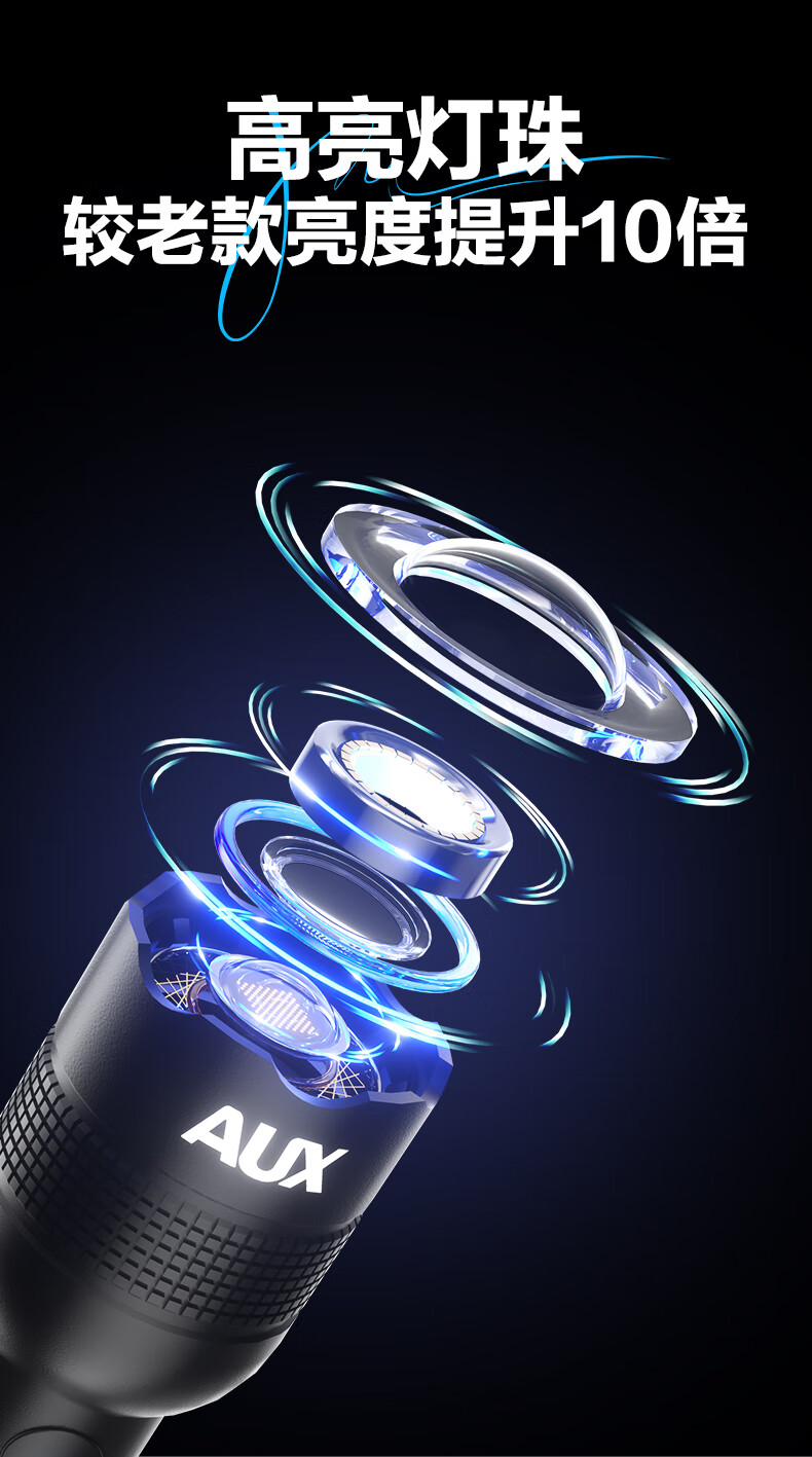 奥克斯(AUX)手电筒强光超亮长续航变焦远射军小型家用应急巡逻 铝合金+快充+变焦+两节电池