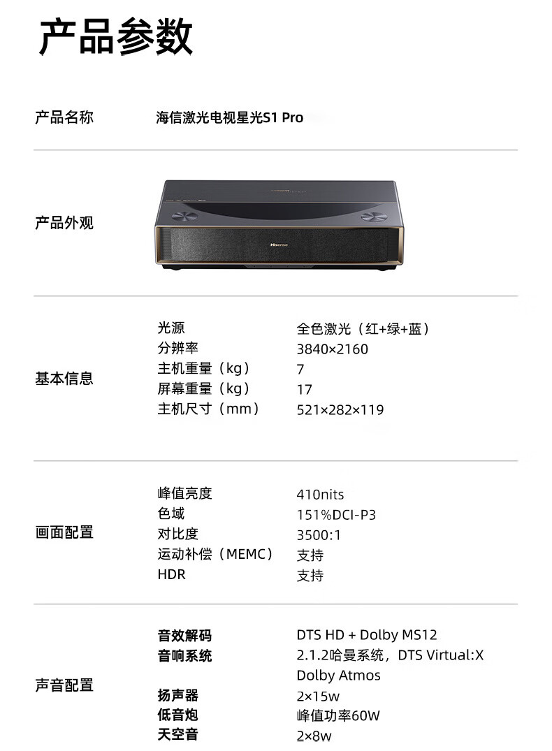 海信激光电视 星光S1Pro 100英寸三色激光投影家庭影院护眼电影院同源 海信S1PRO(100英寸)