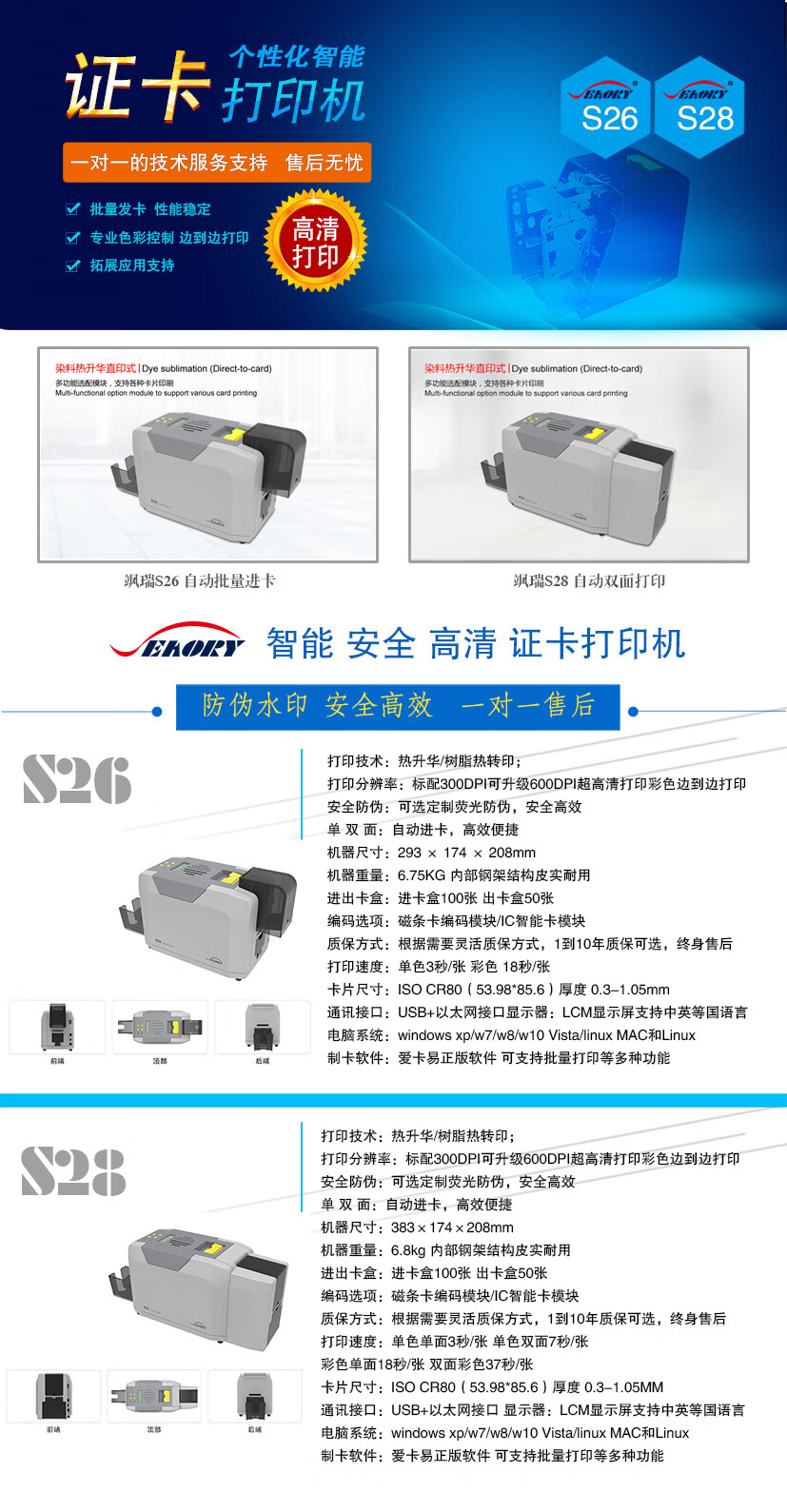 SEAORY证卡打印机S26/S28/S20标配600dpi证卡机全自动双面打印工牌学生卡PVC制卡机员工证芯片门禁卡彩色 飒瑞S28批量自动双面高清600dpi