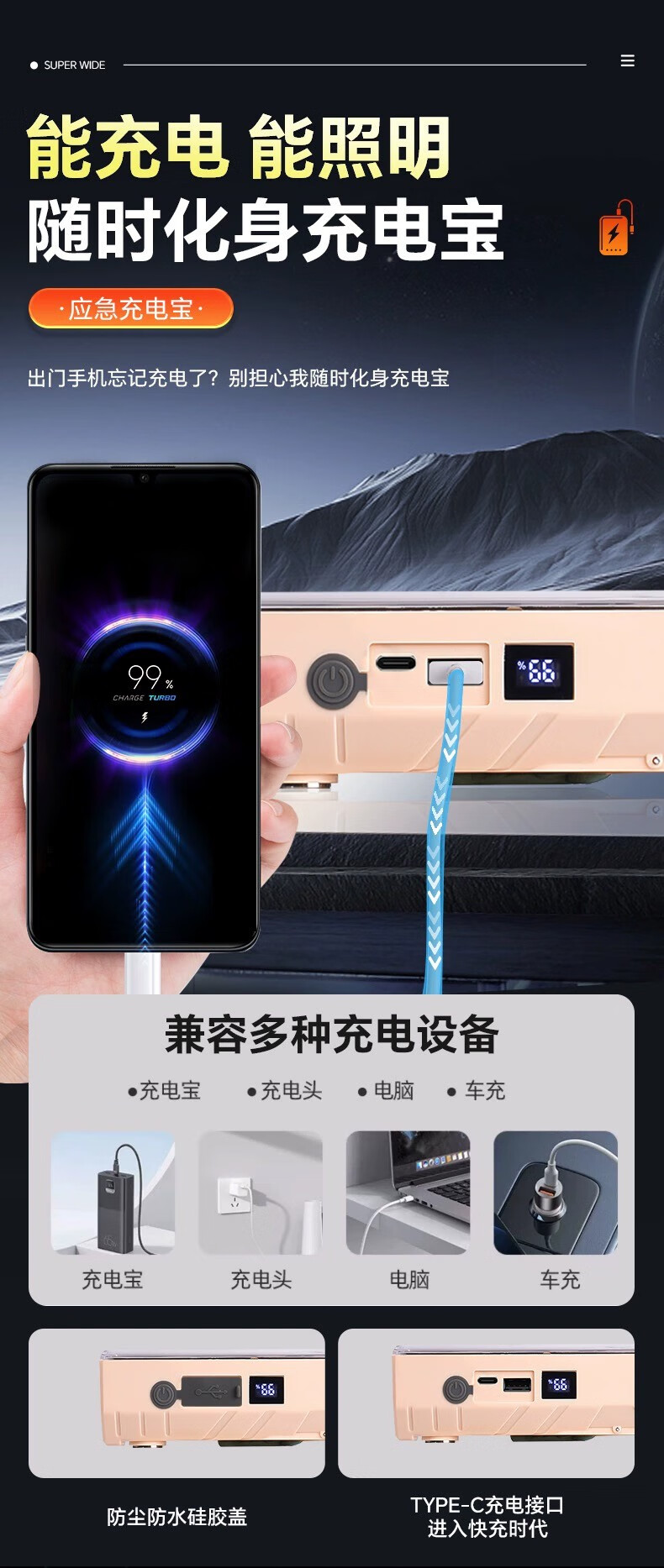 对比了好几款,选了这个应急灯,没选错!户外露营时,磁吸在帐篷外的挂钩上,晚上起夜不用摸黑,亮度刚好不影响别人。摆摊用更合适,我卖小饰品,灯一照饰品光泽都出来了,顾客挑选更方便。续航真的超长,充一次电摆摊能用 3 天(每天开 6 小时),而且灯身不重,提着、挂着都方便,性价比拉满!