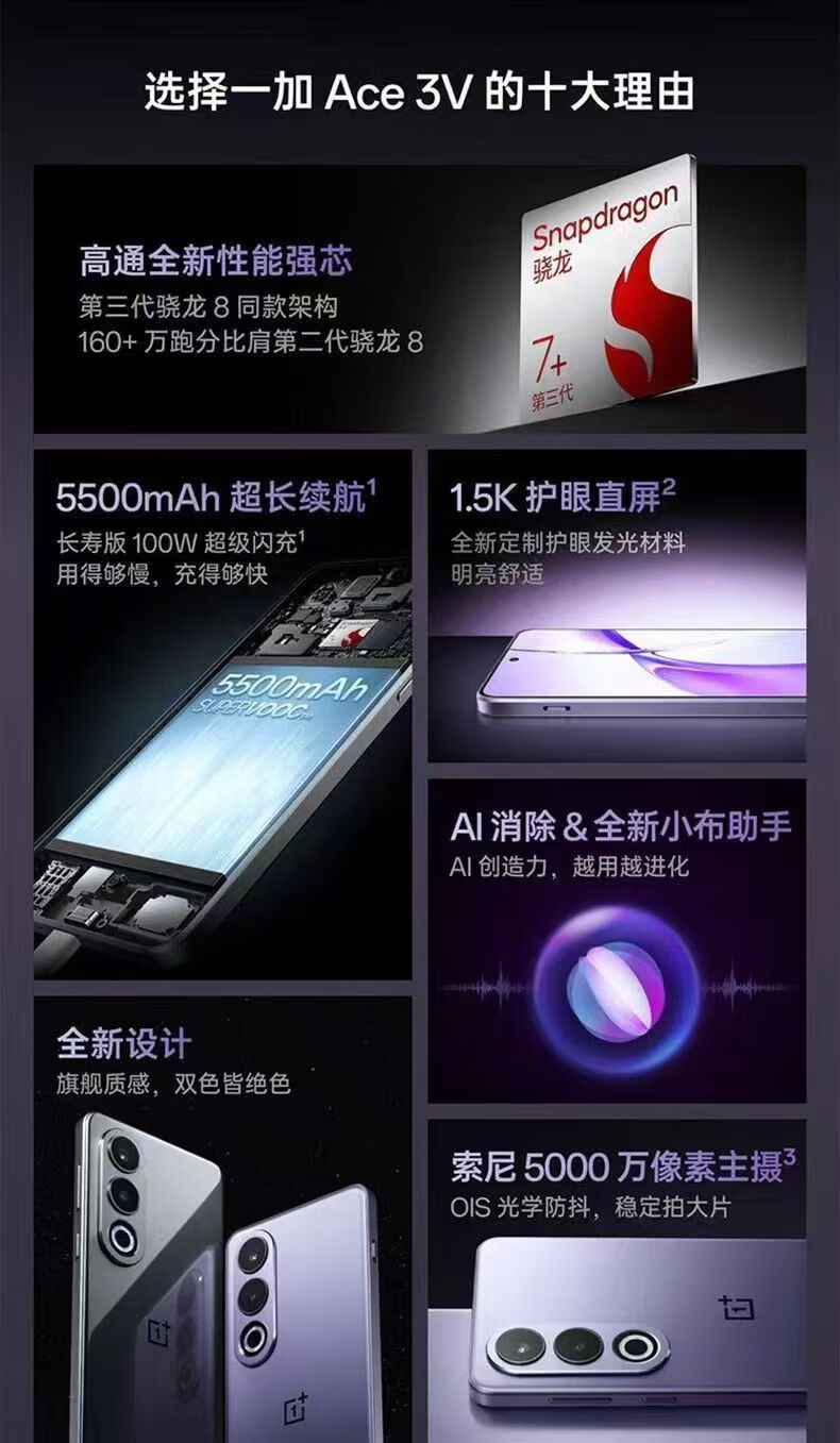 一加展机Ace 3V 5G数字移动 全网通5G 高通第三代骁龙 7+ 芯片高刷屏 幻紫银 12GB+256GB 激活单机+品牌快充+质保一年