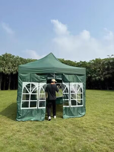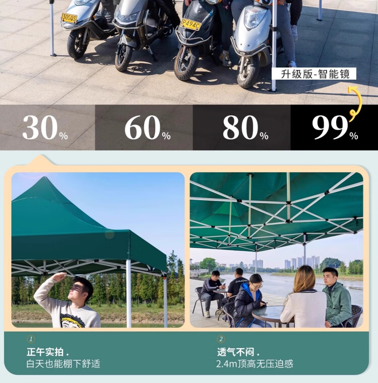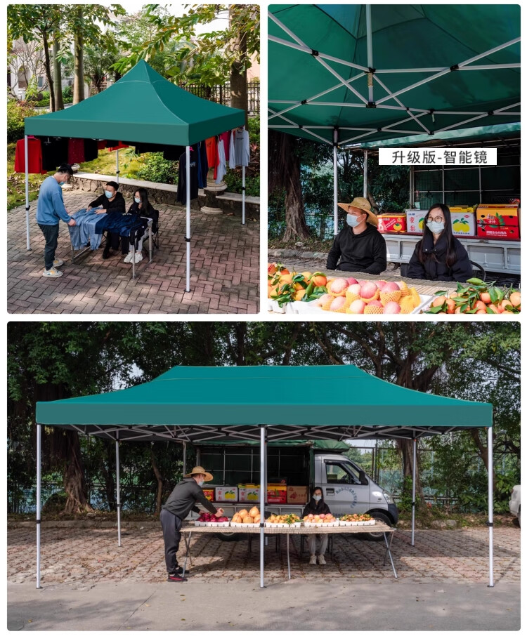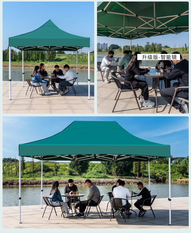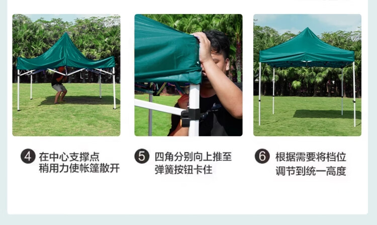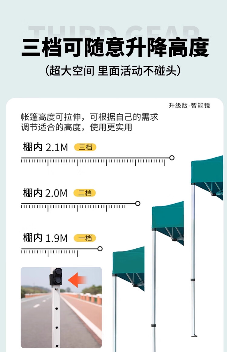 遮阳棚三档可随意升降高度,可根据自己的需求调节适合的高度,大空间里面活动不碰头,帐篷挺拔排水快不积水,顶布防水面料大雨天气快速泄水,棚内防积水大弹簧,自动架大按钮省时省力不伤手,快速收篷一人可操作,免安装折叠不占空间,套上顶布直接打开一人可完成,整体风格百搭,多种款式可选,可满足不同场地大小的需求。
