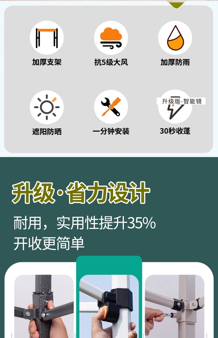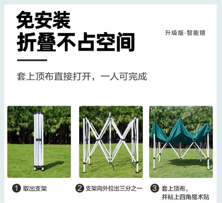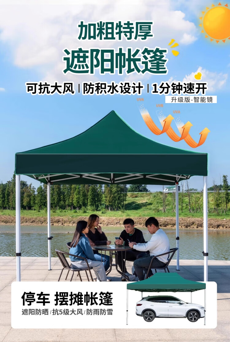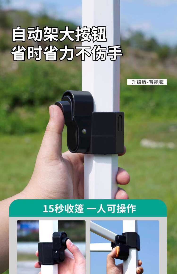 遮阳棚套上顶布直接打开一人可完成,自动架大按钮省时省力不伤手,防积水大弹簧设计,下雨后顶棚能回弹水珠快速滑落,隔热面料棚内不闷热,双层防雨布棚内滴水不漏,免安装折叠不占空间,放进后备箱或角落都方便,三档可随意升降高度,拉到最高时活动空间大,调中档降低受风面,收最低节省占地,可根据自己的需求调节适合的高度,自动架大按钮一按就升,省力又安全防夹手按钮一按即降,收放都安心,多种款式可选,总会有一款适合户外使用。