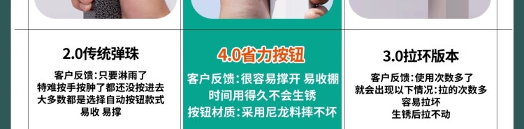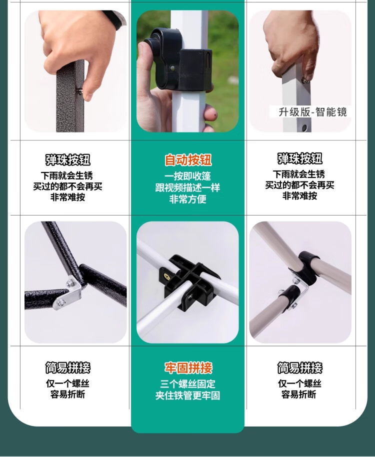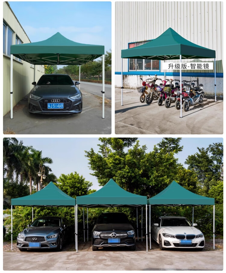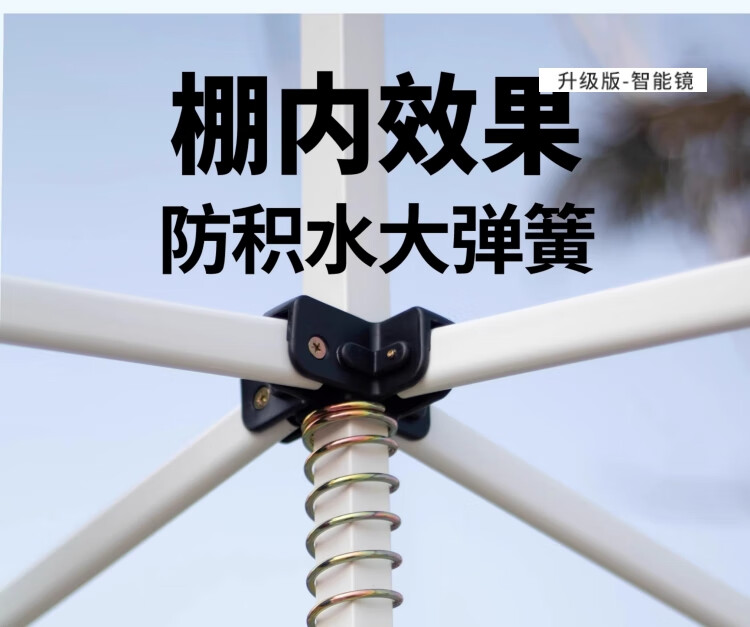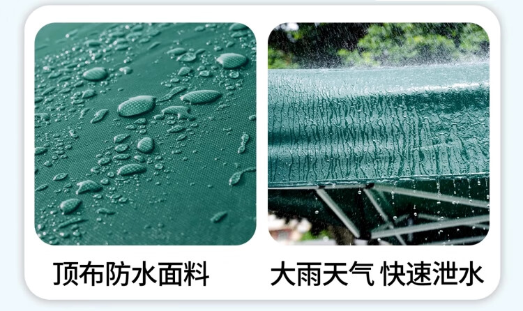 遮阳棚顶布防水面料,大雨天气快速泄水,雨水顺着弧度流走不会堆积,防积水大弹簧让棚顶自动回弹,积水平滑排出不需要手动拍打,防夹手按钮一按即降,收篷时手指放旁边也不怕被夹,免安装折叠不占空间,放进后备箱或角落都方便,三档可随意升降高度,拉到最高时活动空间大,调中档降低受风面,收最低节省占地,可根据自己的需求调节适合的高度,多种款式可选,总会有一款适合你家需求。