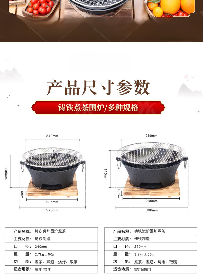 铸铁炤收到,很重实,也很美观,非常实用,煮茶煮水很方便,烤网也能放很多东西,东西还是不错的总体很好,毕竟价格便宜,好评。