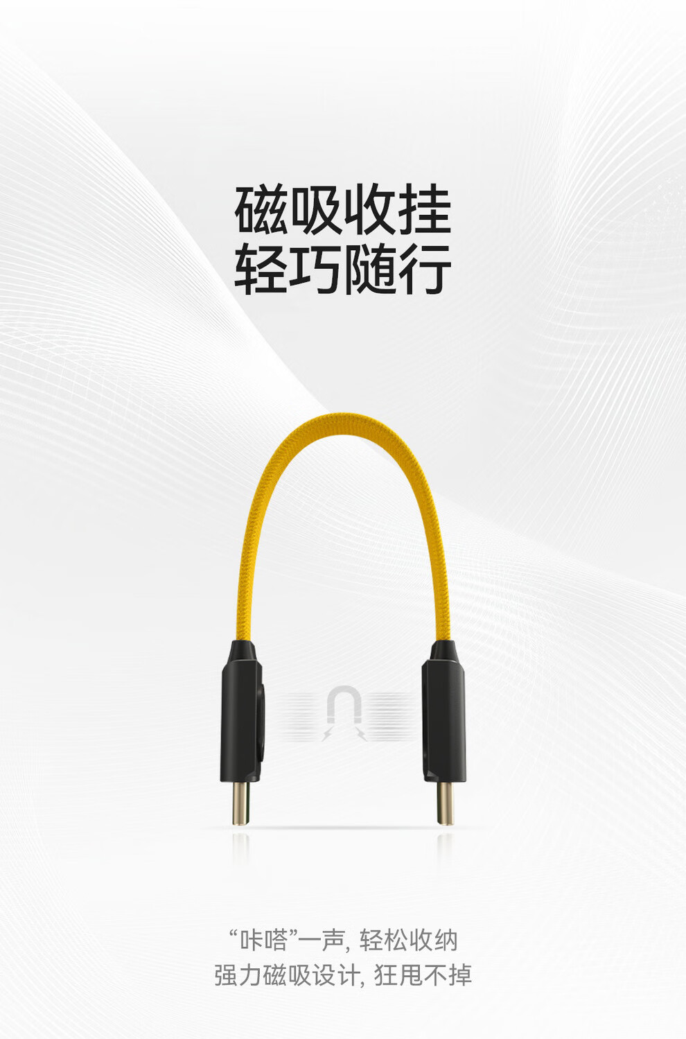这个磁吸充电线很小巧,很轻便,黄色配色很亮眼,磁吸可以挂在很多地方方便拿取,底下还有小盖子保护金属头,就是包装有待改进。