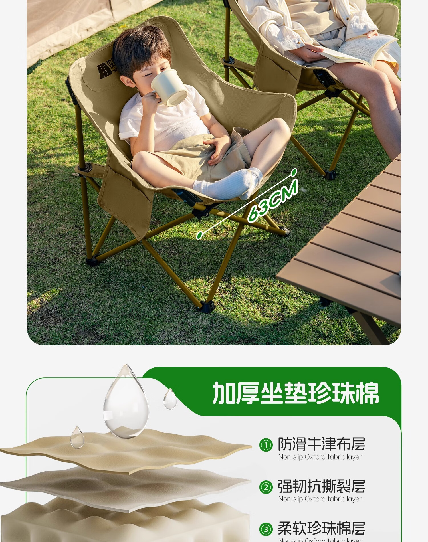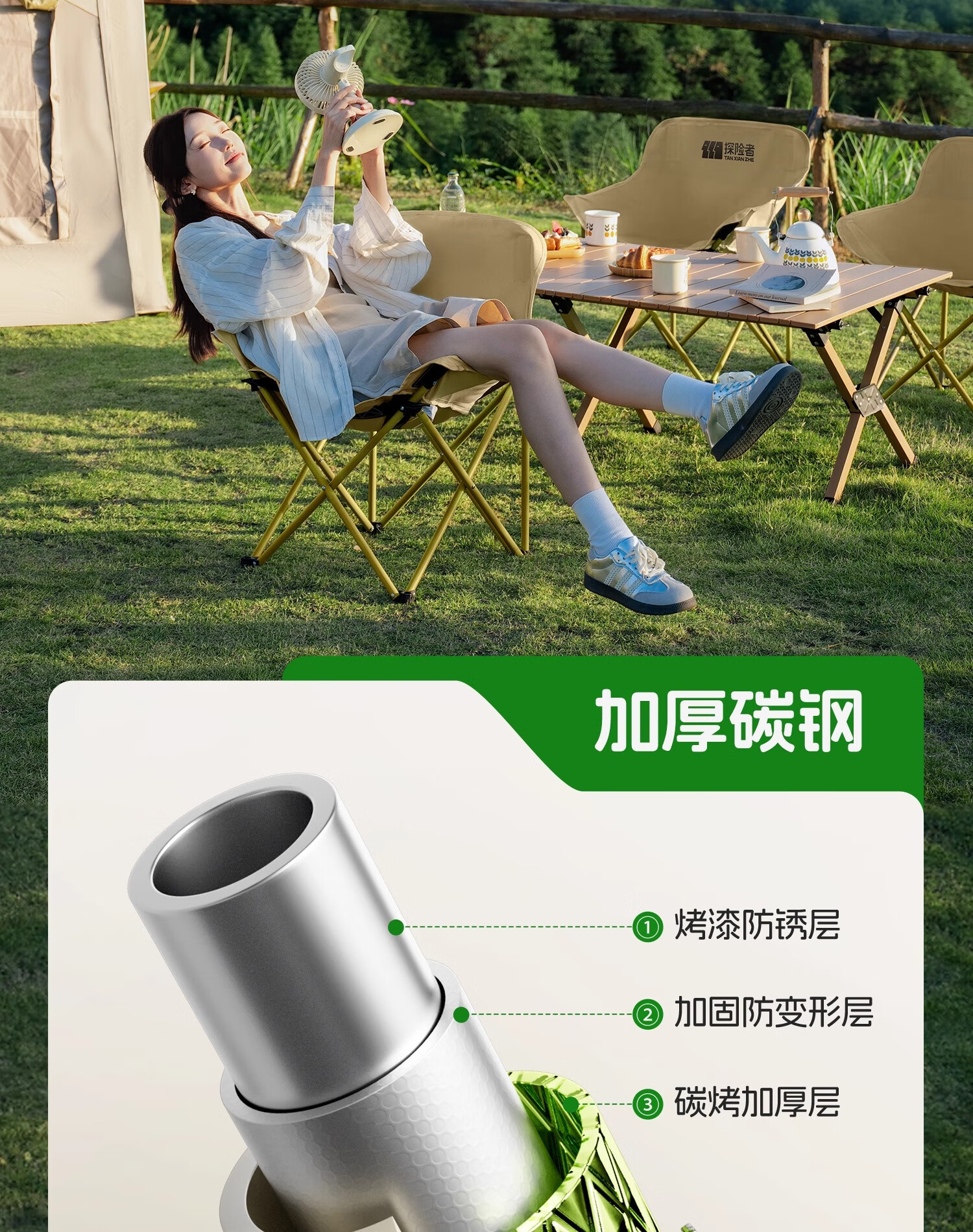 探险者户外折叠椅露营椅子月亮椅沙滩钓鱼椅野餐桌椅家用凳子 软包暖沙折叠椅*2+90cm蛋卷桌(赠收纳袋)