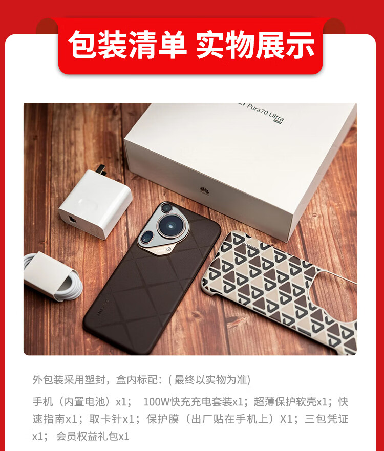 官方标配1手机(内置电池)x1;2华为SuperCharge充电器x1;3USBType-C数据线x1;4印花保护壳x1;5快速指南x1;6取卡针x1;7保护膜(出厂已贴在手机上)x1;8三包凭证x1