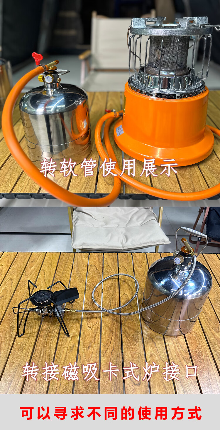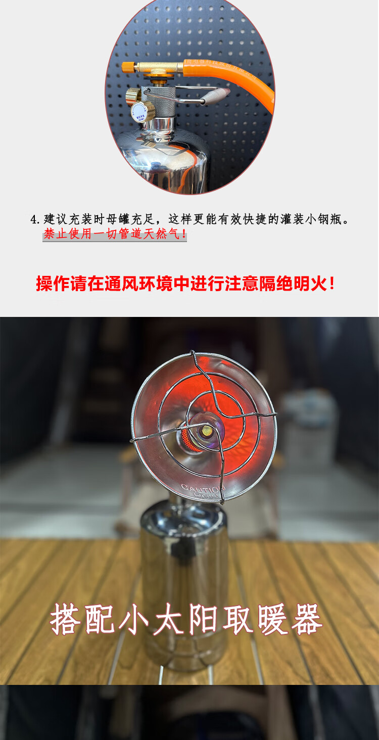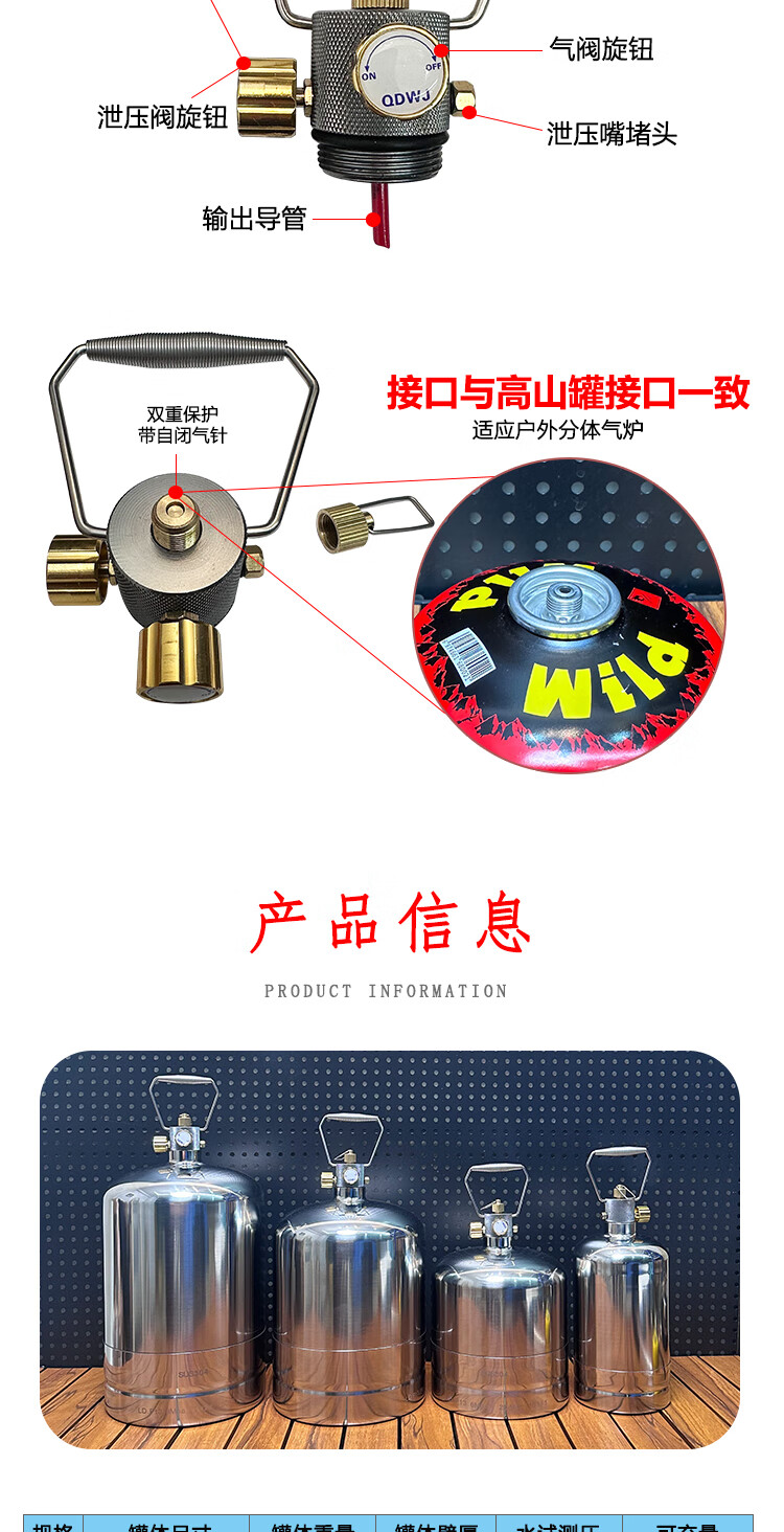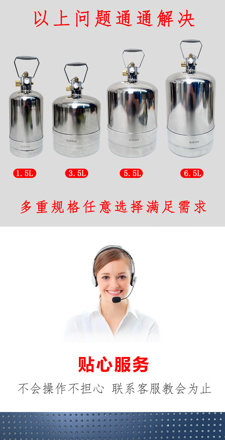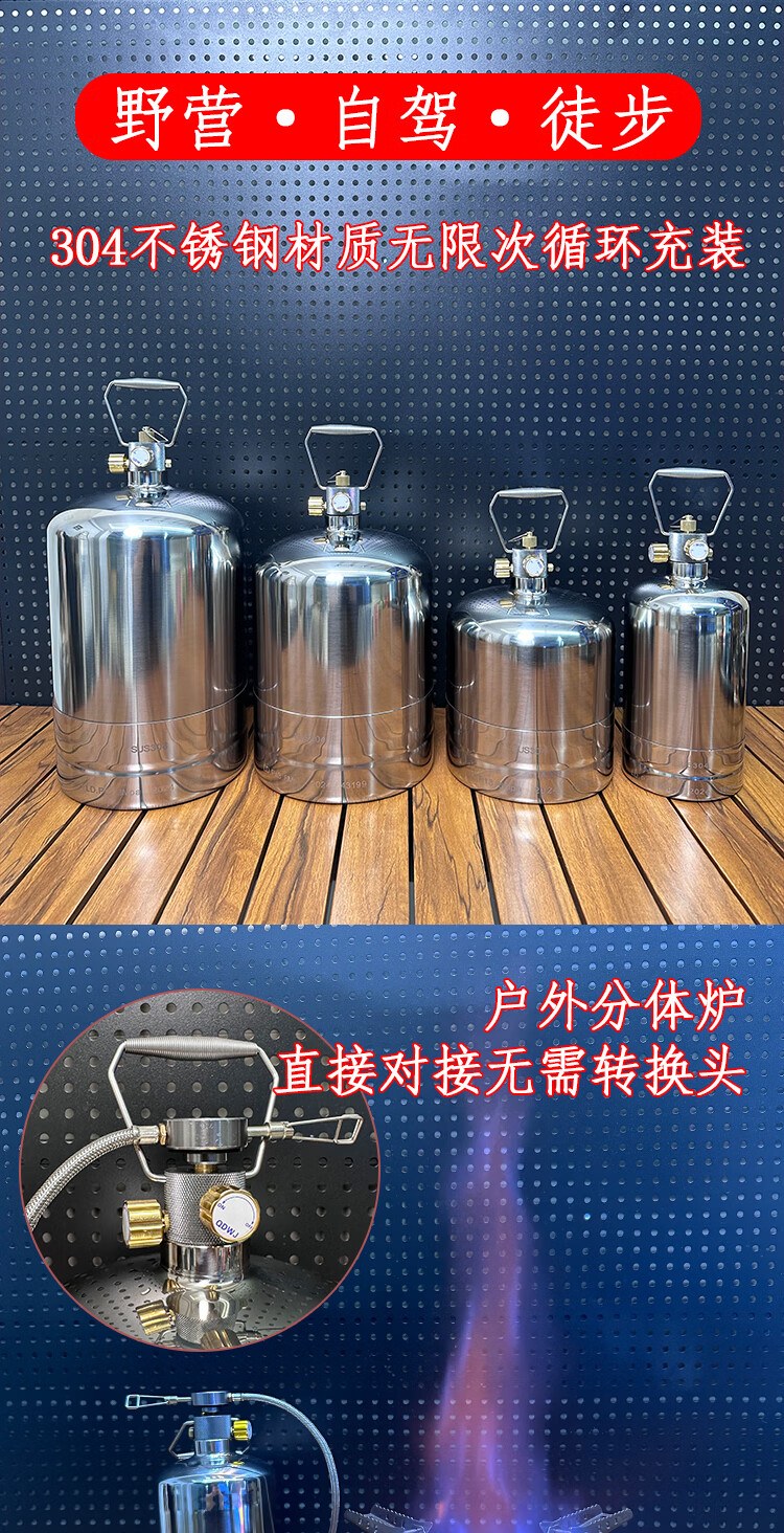 户外充气瓶304不锈钢瓶液化气循环气罐煤气储能泄压野餐露营房车 双阀甁头