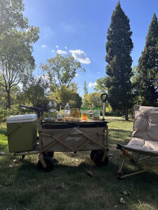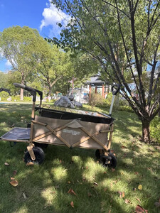车子的做工很精细,一些小细节上做的很好,承重方面也很出色,大大小小的东西加起来大概有个180斤左右,轮子自带轴承,前轮是万向轮设计转向超级很方便,拉起来非常省力,车轮自带刹车,可以防止溜车的情况,感觉对得起这个售价,空间比较大,天幕帐篷也能放下,桌椅,躺椅,保温箱,地垫…通通放下,轻松拿捏,车车颜值高,天气好,心情相当美丽,享受生活,享受大自然带来的欢乐,树荫下,带上我的露营小装备,约上好朋友,清风徐徐,感受下清风拂面的放松,也感受下的快乐
