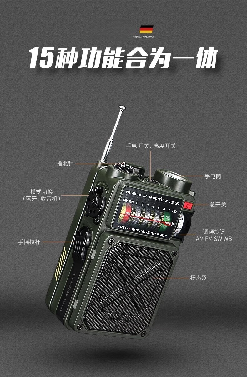 GERTHRON德国手摇发电收音机手电筒防灾地震应急战备太阳能充电供电一体机 【顶配款】全波段收音机+太阳能+手摇充电 【手电筒/手摇/太阳能/SOS/蓝牙/收音机】