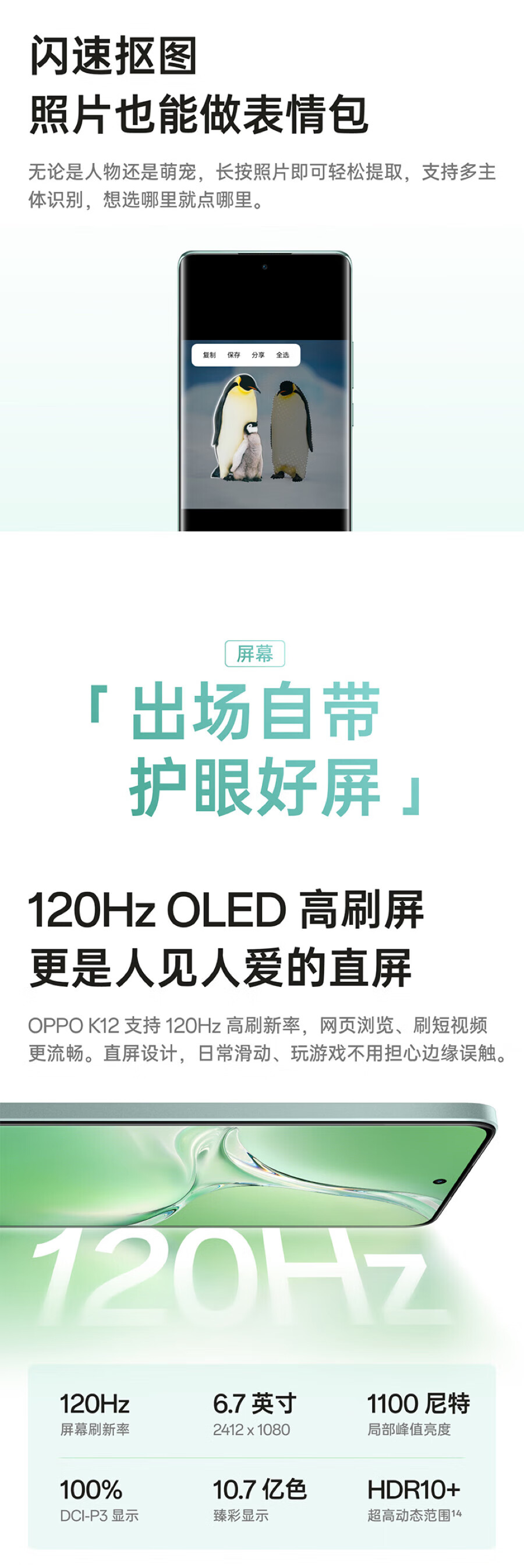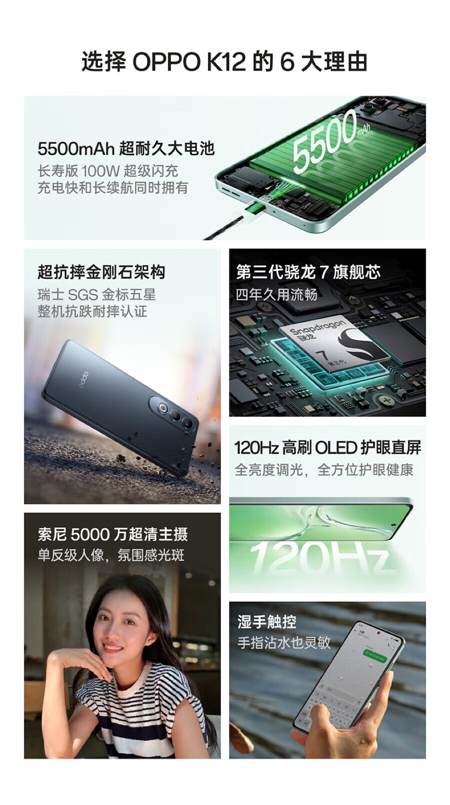 OPPOK12 【全新未拆封未激活+全国联保】5500mAh大电池 第三代骁龙7芯片 120Hz护眼5G直屏AI手机 K12-青云 8GB+256GB